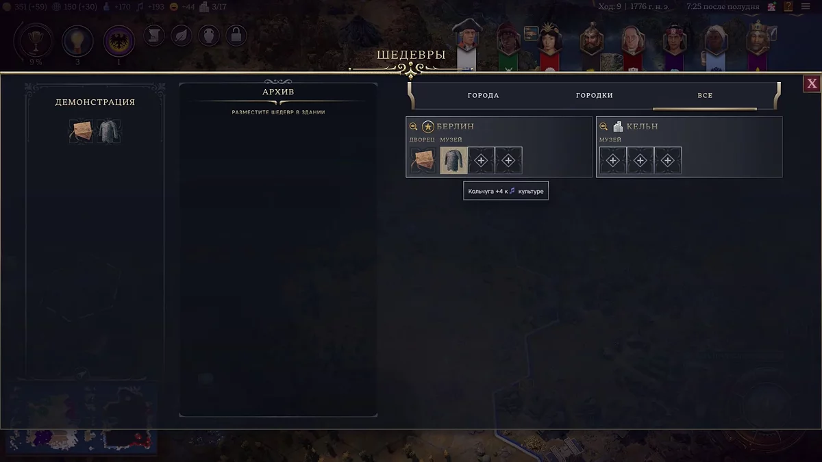 После активации сбора исследователь спустя какое-то время откопает что-нибудь раритетное: бумажку, топор или кольчугу прошлых эпох. Но на этом работа не заканчивается. Далее нам нужно разместить артефакт в одном из зданий. Понадобится музей или дворец. Чем больше у нас музеев, тем больше реликвий мы можем выставить на показ. Используемые артефакты также дают бонус к культуре страны.