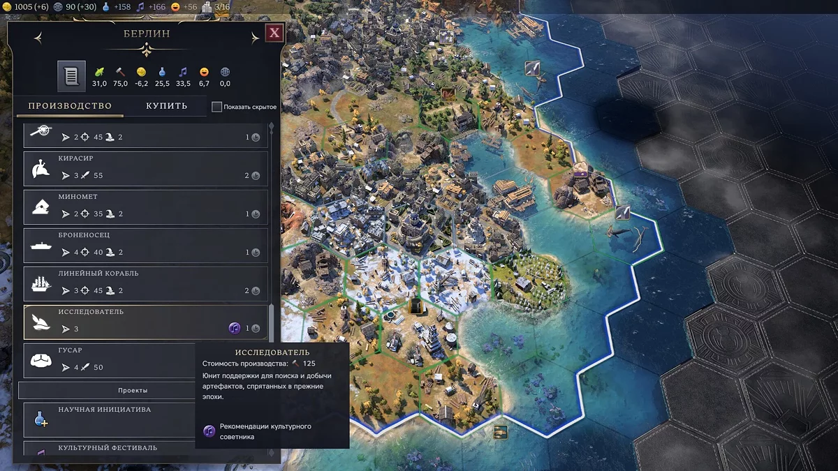 Для начала нам необходимо исследовать одну из культурных веток нашей державы — «Естественная история». После ее открытия мы сможем создавать специальных юнитов — исследователей.