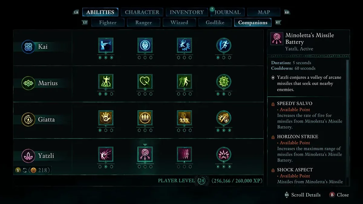После получения первого компаньона вы также получите новую вкладку на экране способностей в меню. Она содержит ряд способностей, которые вы можете улучшить. У каждого компаньона есть четыре основные способности, имеющих три степени прокачки.