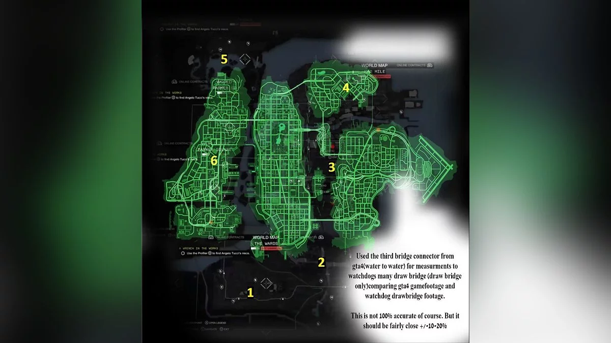 Далее он взял карту Watch Dogs и сверху нее наложил карту GTA 4. Пользователь так же отметил, что он не гарантирует 100% точности, однако максимальная погрешность — не более 10-20 процентов.