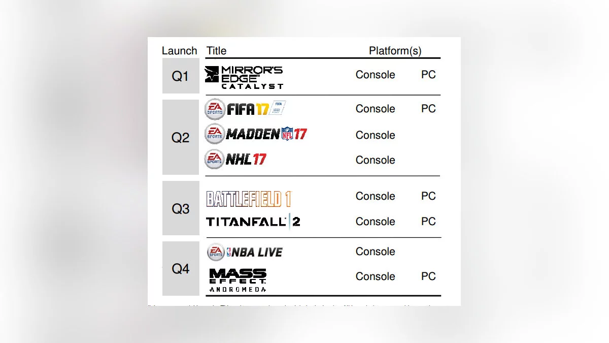 В этом году Electronic Arts намерена выпустить такие игры, как Mirror's Edge: Catalyst, FIFA 17, NHL 17, Madden NFL 17, Battlefield 1, Titanfall 2, NBA Live 17, а также Mass Effect: Andromeda.