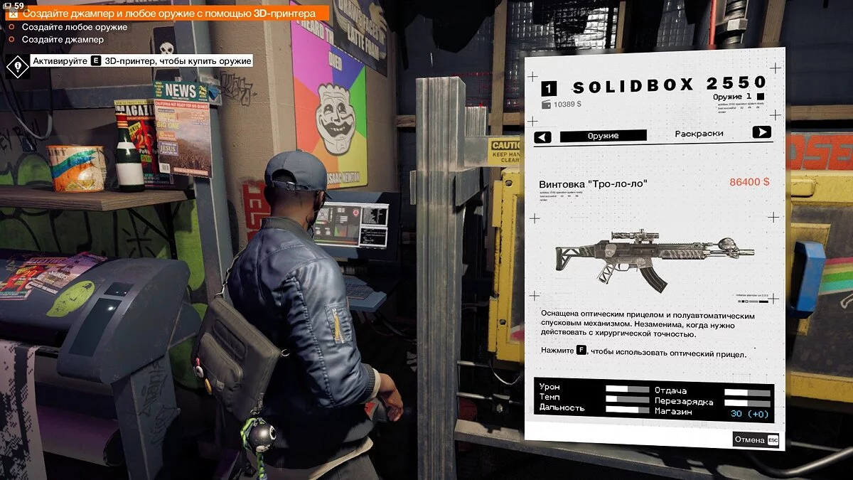 Конечно, можно использовать оружие, которым снаряжены противники, но лучше всего, как ни странно, потратиться на хороший «ствол», напечатанный на 3D-принтере. Такое оружие, вопреки всякой логике, стоит дороже, а боевые показатели у него выше, чем у аналогов из арсенала противников. Зачем печатать себе «огнестрел», когда в США на него и так полный «легалайз» — никому неизвестно.