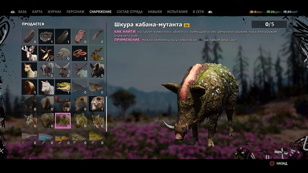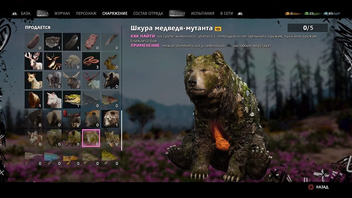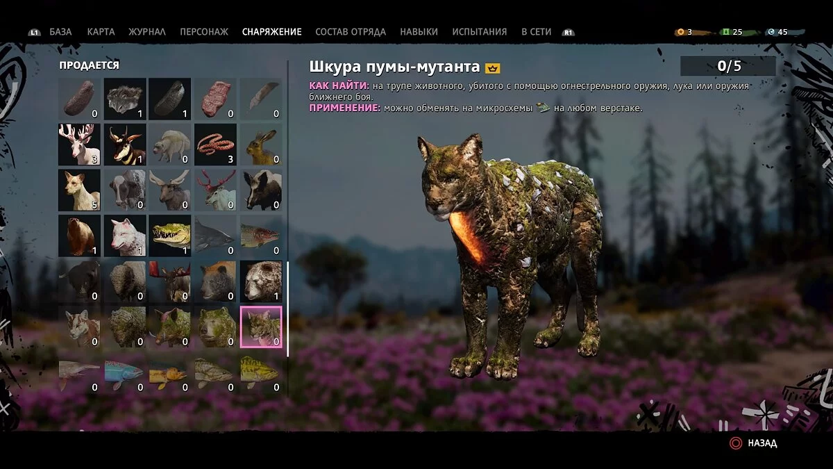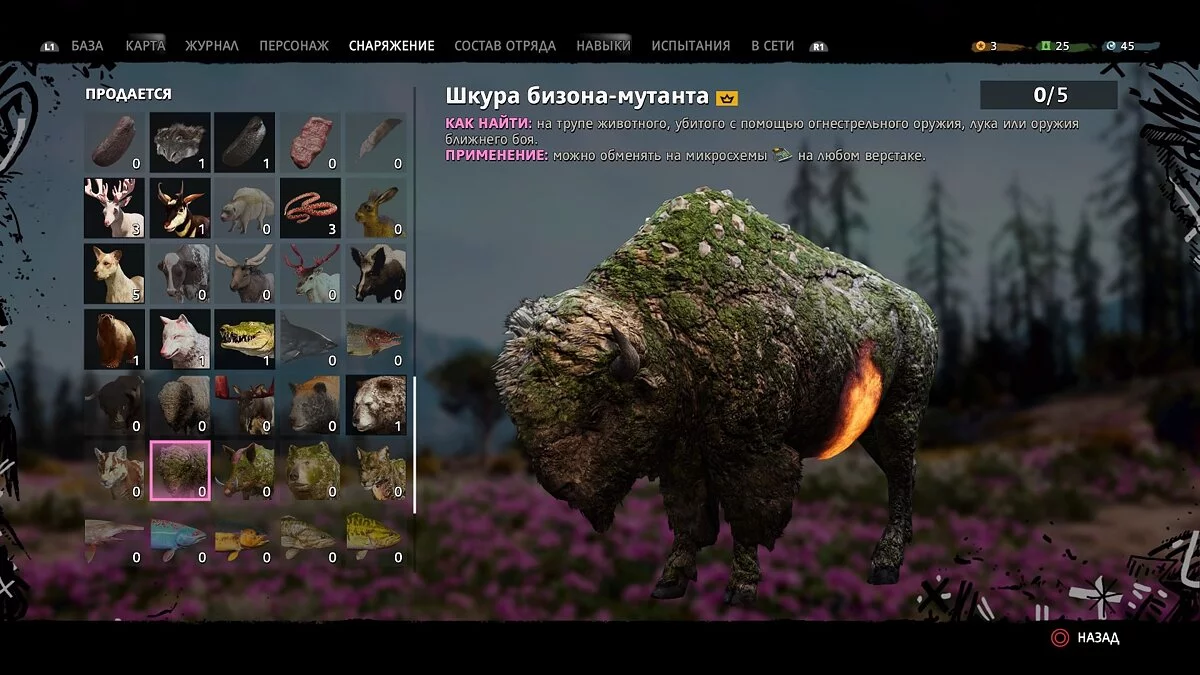 В Far Cry New Dawn есть четыре вида животных-мутантов. Это Бизон, Кабан, Пума и Медведь. Они возрождаются в тех областях, которые отмечены в гайде. Их шкуры нужны для создания элитного оружия. Вы также можете обменять шкуры на очень ценные ресурсы, такие как микросхемы (circuit boards) и углеволокно (carbon fiber).