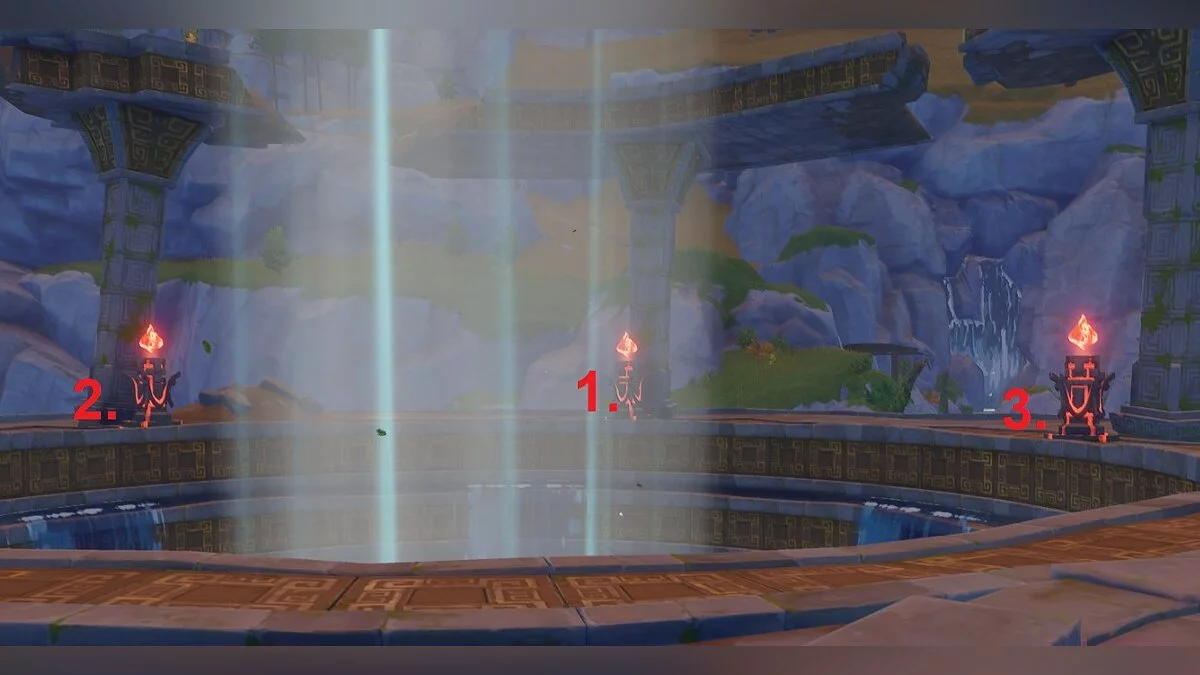 Когда вы окажетесь на нужной локации, обратите внимание на три огненных тотема. Их нужно активировать Пиро-атаками в определённой последовательности. Если вы встанете на голубой круг и посмотрите на них, то порядок будет следующим: