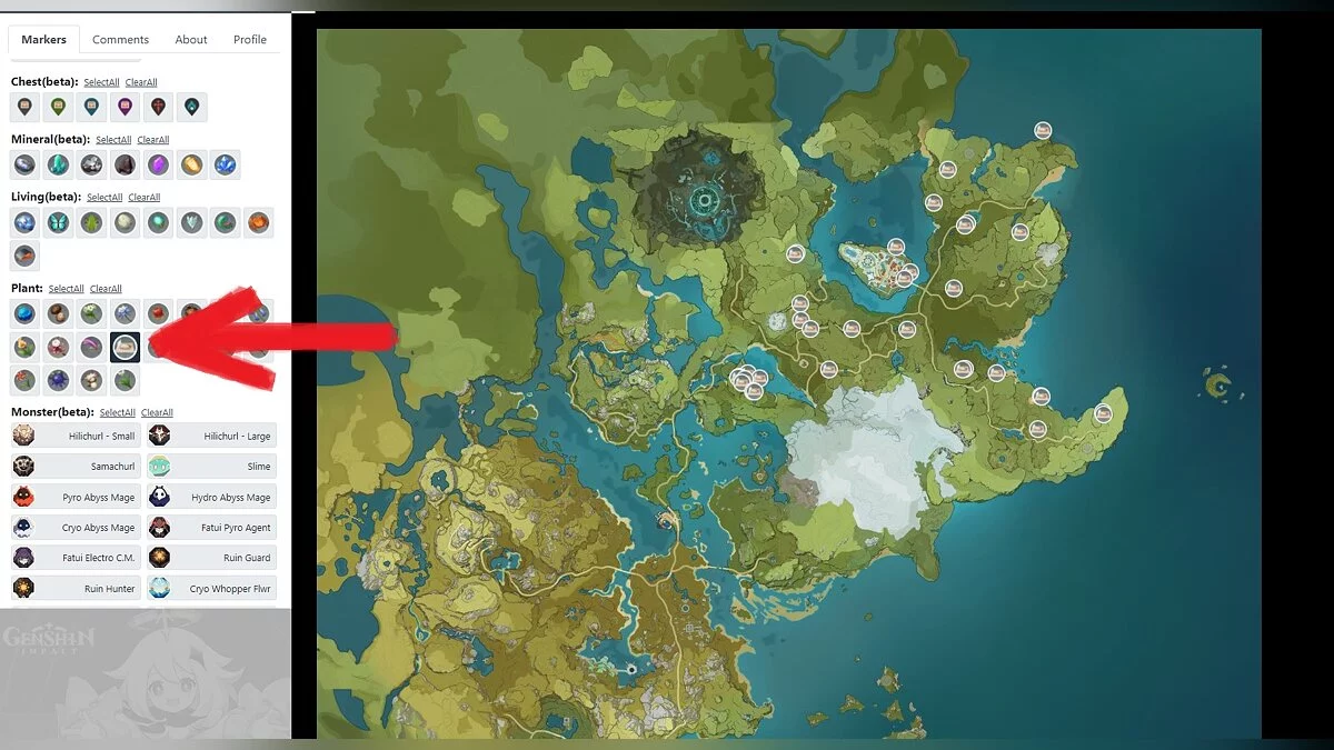 Точное местоположение одуванчиков можно узнать при помощи интерактивной карты. Для этого перейдите по ссылке и нажмите на иконку «Семена одуванчика» (Dandelion seeds) в меню «Растения» (Plants).