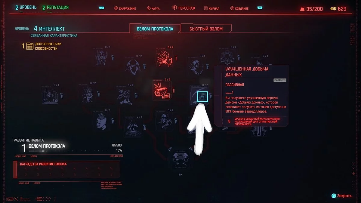 - Взламывайте точки доступа (Access Point). Они представляют собой компьютеры, которые установлены на стене. Чаще всего точки доступа встречаются на вражеской территории. Если у вас получится взломать ее, то вы получите полный доступ ко счету владельца. Когда достигнете 5-го уровня Интеллекта, приобретите перк «Улучшенная добыча данных» (Advanced Datamine). С ним ваша награда вырастет на 50% или 100%, в зависимости от его прокачки. Средняя сумма, которую вы будете получать при взломе, достигнет 600 евродолларов. Имейте ввиду, что подобная процедура считается преступлением.