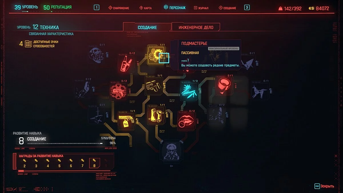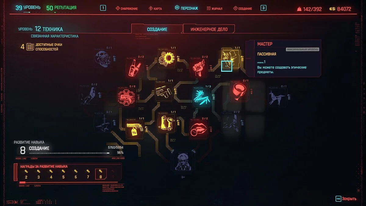 С повышением уровня техники, вам нужно прокачать перки: «Подмастерье» (позволяет создавать редкие предметы), «Мастер» (позволяет создавать эпические предметы), «Изобретатель» (позволяет создавать легендарные предметы). С прокаченными перками, переходим на вкладку «Создание». Для начала переключаем в подменю «Улучшения» и в нем ищем необходимый вам предмет одежды. Для повышения уровня вам понадобятся компоненты. Как их получить и собрать необходимые, вы узнаете из нашего другого гайда. Зажимаем кнопку «Улучшить» и получаем повышенные характеристики на предмете. Затем повторяйте данную процедуру до тех пор, пока предмет не исчезнет из списка для дальнейших улучшений.