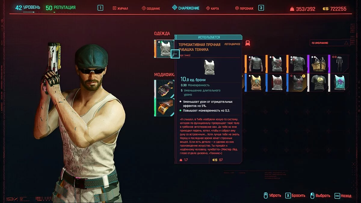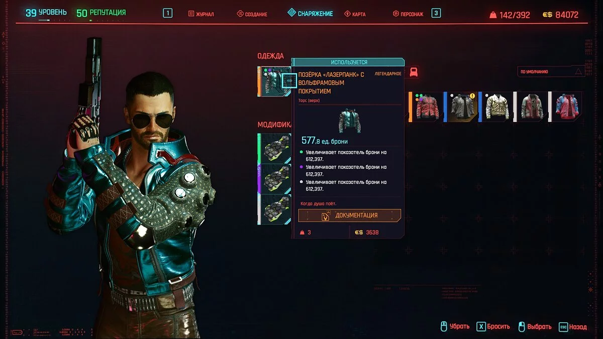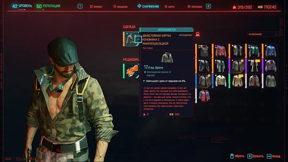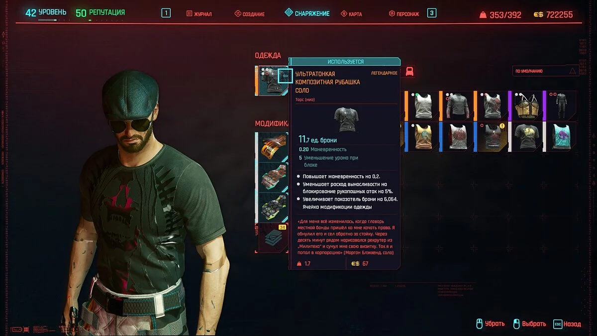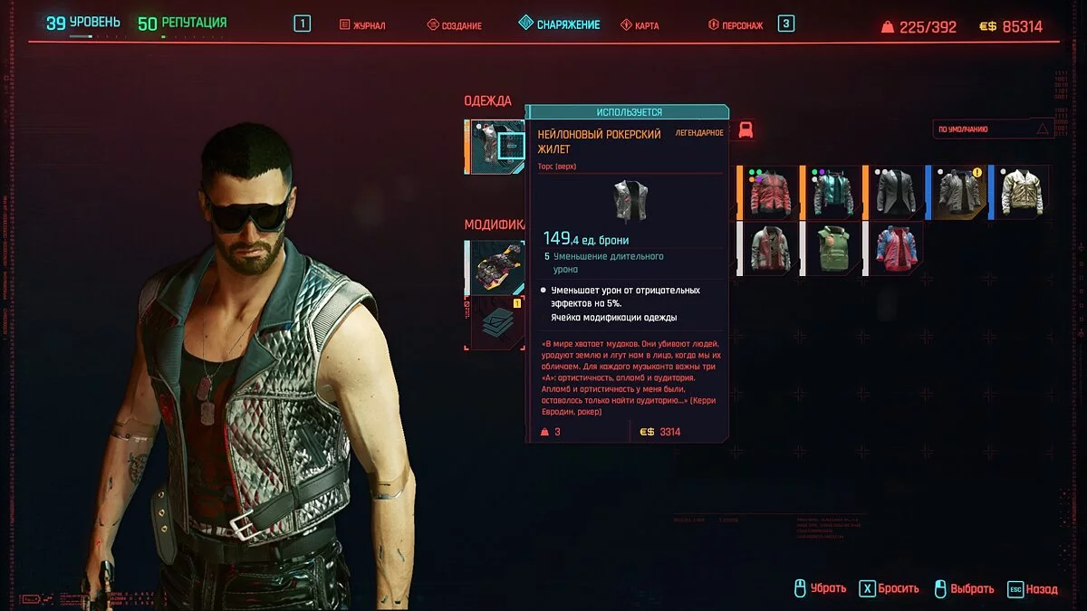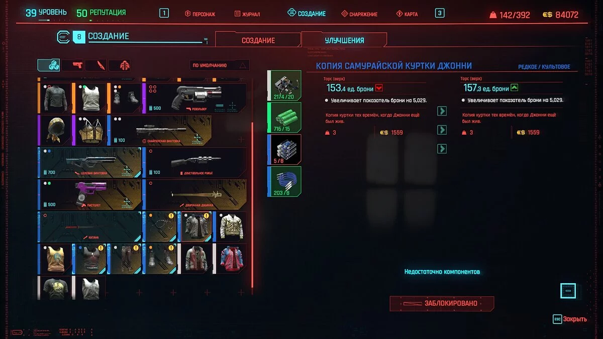 Вот мы получили максимально прокачанную вещь. Если по характеристикам она вам не подходит, но внешне очень нравится (мне, например, очень понравилась одежда Джонни), то переходим снова на вкладку «Создание» и ищем ваш предмет одежды, который есть на текущий момент. То есть, если у вас предмет редкий, то в меню крафта он будет «фиолетовым». Вам также понадобятся мелкие детали для создания новой версии брони. Зажимаем кнопку «Изготовить» и получаем новую улучшенную версию брони. Вы должны сразу понимать, что это будет совершенно новый тип одежды, который не будет внешне отличаться от предыдущего, но при этом может получить карманы для модификаций и измененные характеристики.