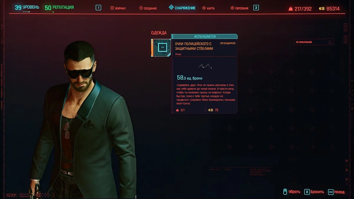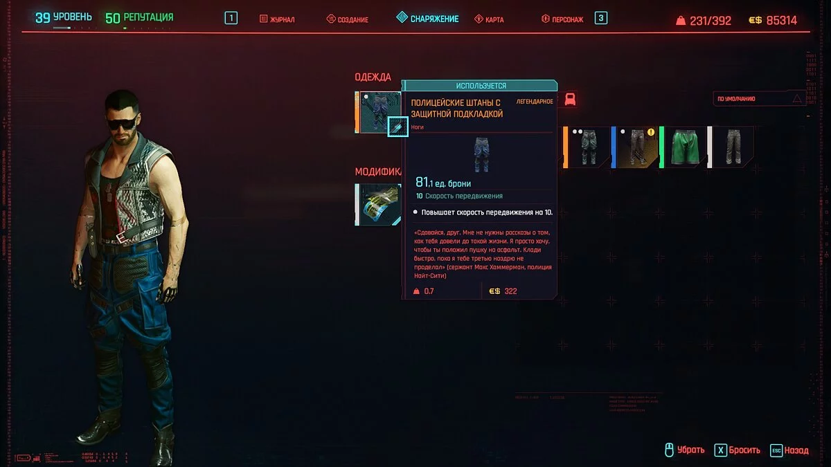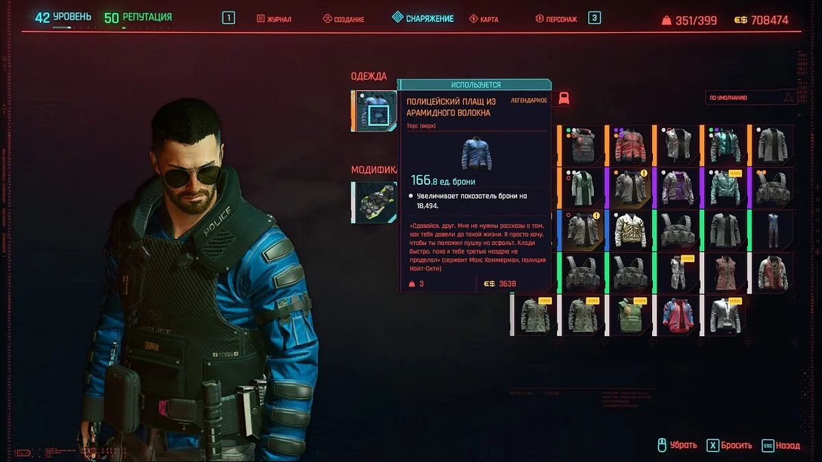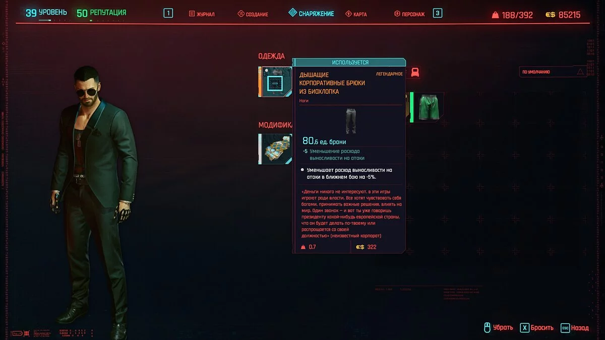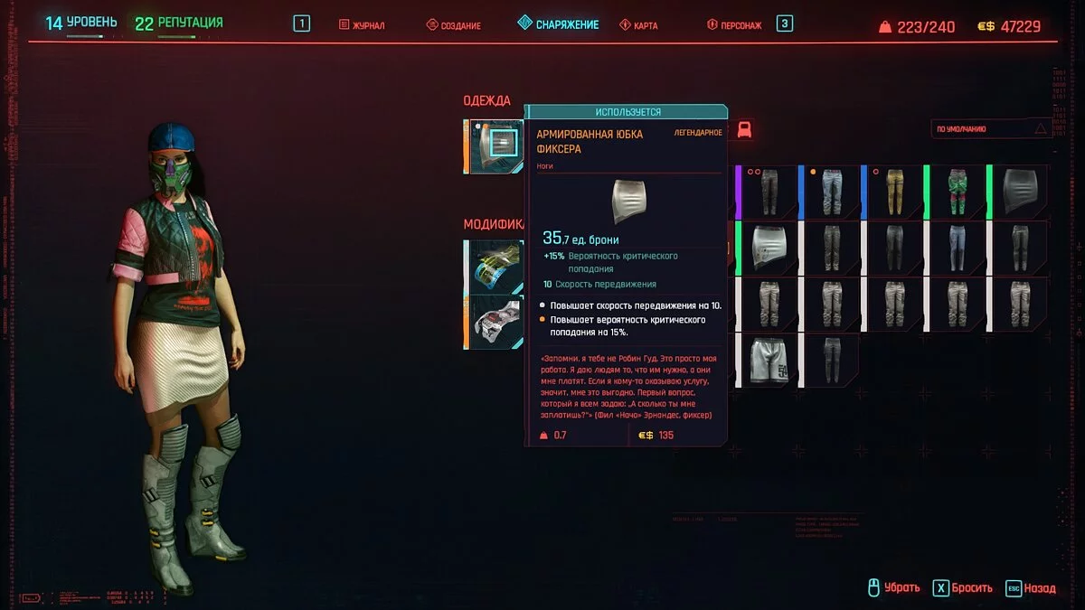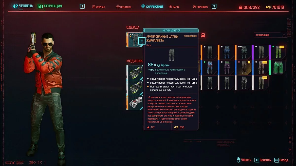 Вот мы получили максимально прокачанную вещь. Если по характеристикам она вам не подходит, но внешне очень нравится (мне, например, очень понравилась одежда Джонни), то переходим снова на вкладку «Создание» и ищем ваш предмет одежды, который есть на текущий момент. То есть, если у вас предмет редкий, то в меню крафта он будет «фиолетовым». Вам также понадобятся мелкие детали для создания новой версии брони. Зажимаем кнопку «Изготовить» и получаем новую улучшенную версию брони. Вы должны сразу понимать, что это будет совершенно новый тип одежды, который не будет внешне отличаться от предыдущего, но при этом может получить карманы для модификаций и измененные характеристики.