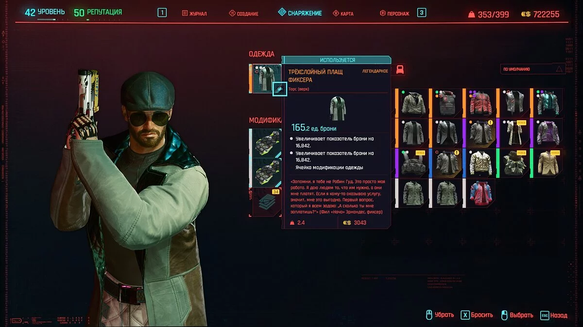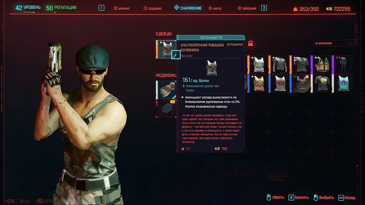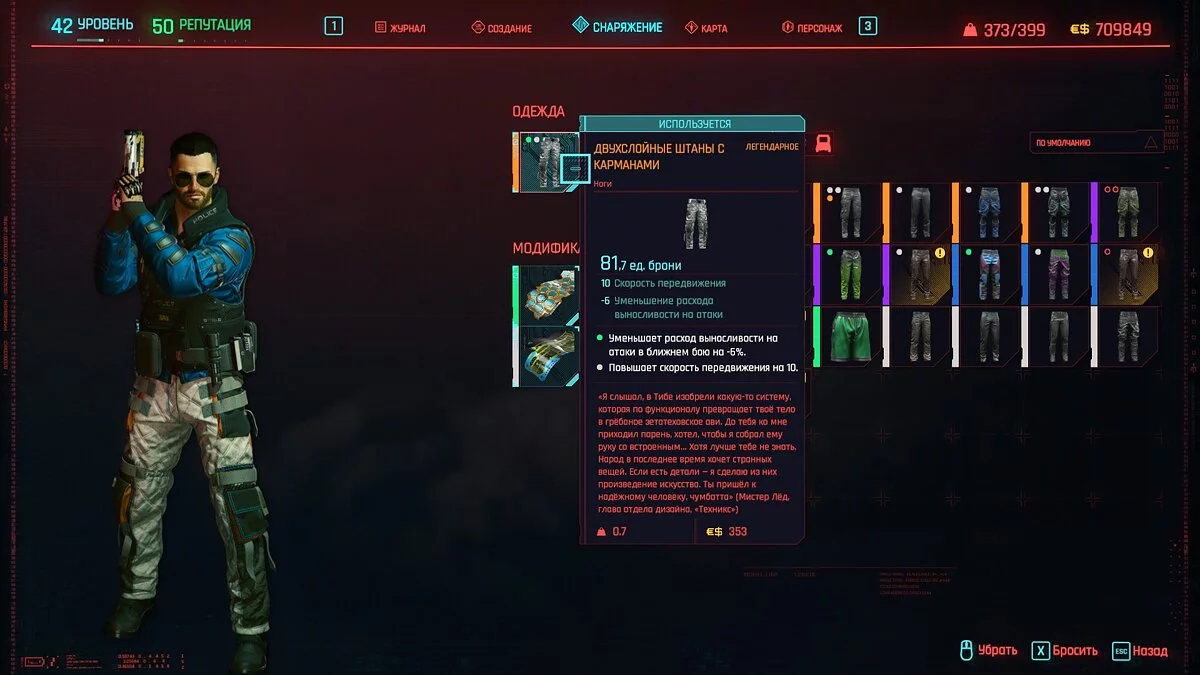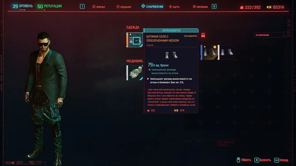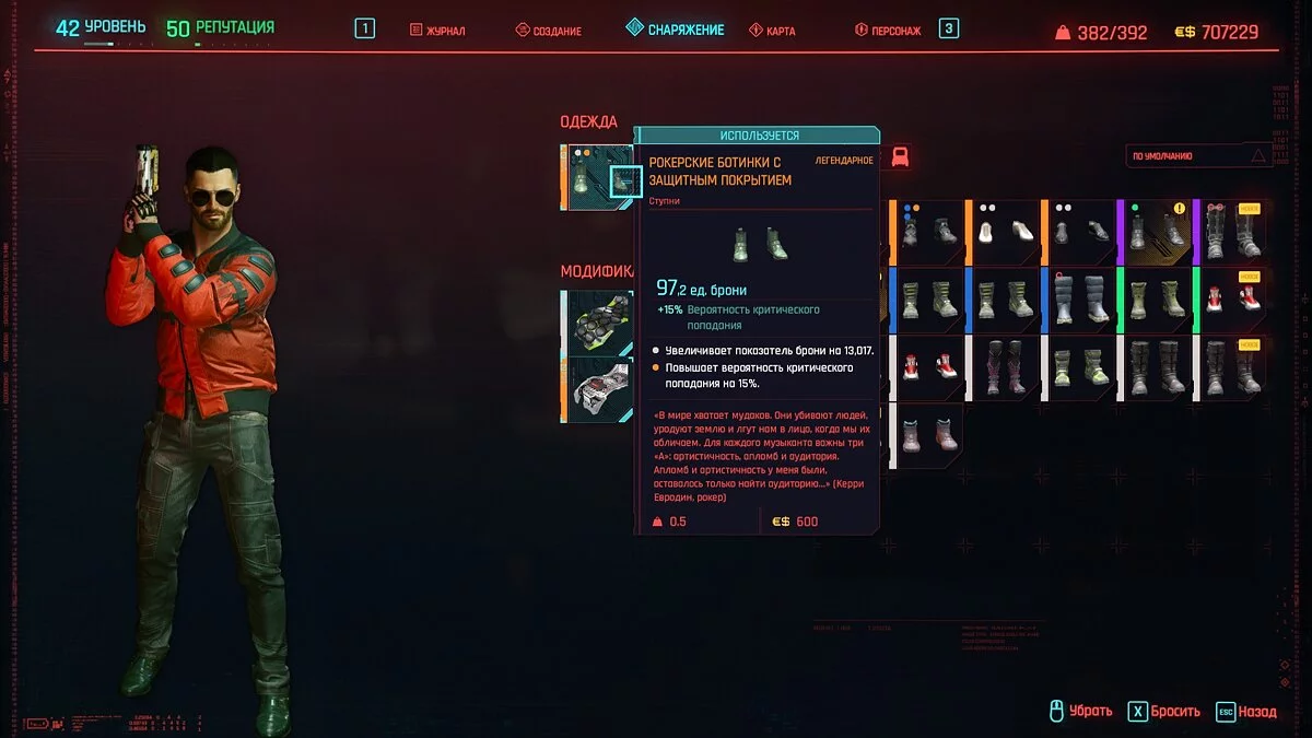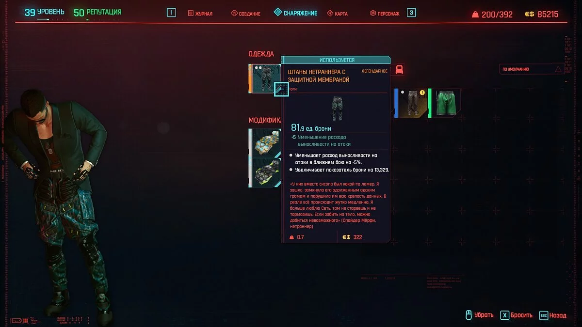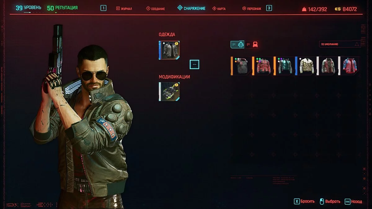 Вот мы получили максимально прокачанную вещь. Если по характеристикам она вам не подходит, но внешне очень нравится (мне, например, очень понравилась одежда Джонни), то переходим снова на вкладку «Создание» и ищем ваш предмет одежды, который есть на текущий момент. То есть, если у вас предмет редкий, то в меню крафта он будет «фиолетовым». Вам также понадобятся мелкие детали для создания новой версии брони. Зажимаем кнопку «Изготовить» и получаем новую улучшенную версию брони. Вы должны сразу понимать, что это будет совершенно новый тип одежды, который не будет внешне отличаться от предыдущего, но при этом может получить карманы для модификаций и измененные характеристики.