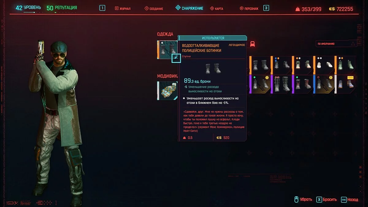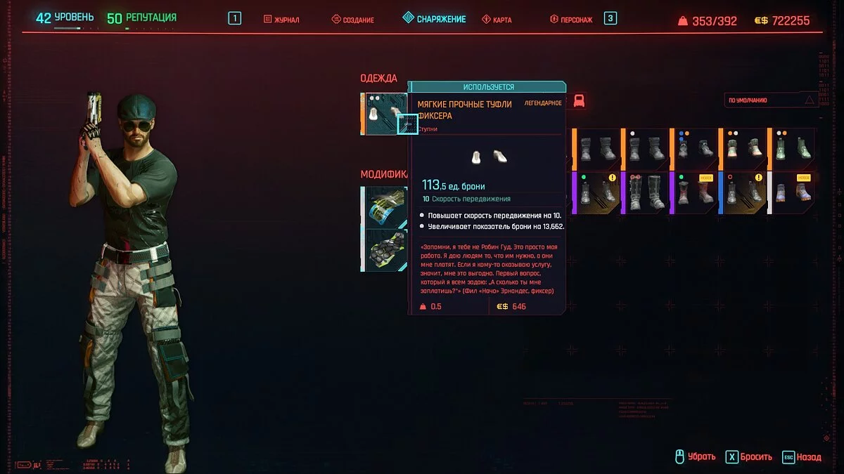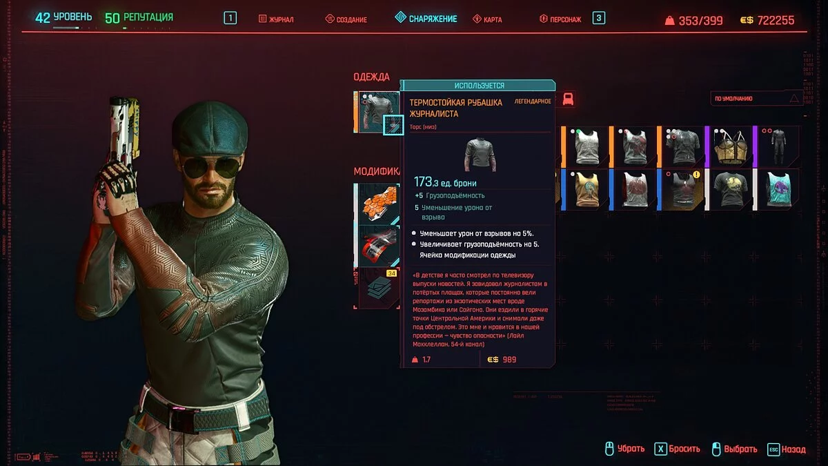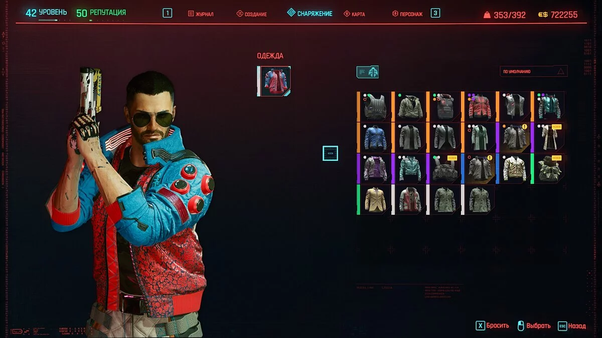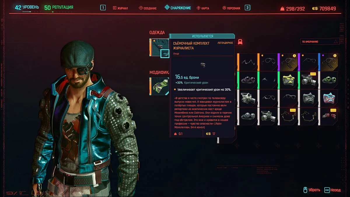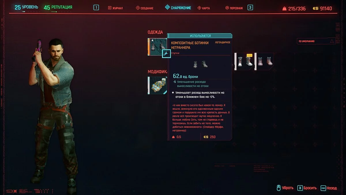 Вот мы получили максимально прокачанную вещь. Если по характеристикам она вам не подходит, но внешне очень нравится (мне, например, очень понравилась одежда Джонни), то переходим снова на вкладку «Создание» и ищем ваш предмет одежды, который есть на текущий момент. То есть, если у вас предмет редкий, то в меню крафта он будет «фиолетовым». Вам также понадобятся мелкие детали для создания новой версии брони. Зажимаем кнопку «Изготовить» и получаем новую улучшенную версию брони. Вы должны сразу понимать, что это будет совершенно новый тип одежды, который не будет внешне отличаться от предыдущего, но при этом может получить карманы для модификаций и измененные характеристики.