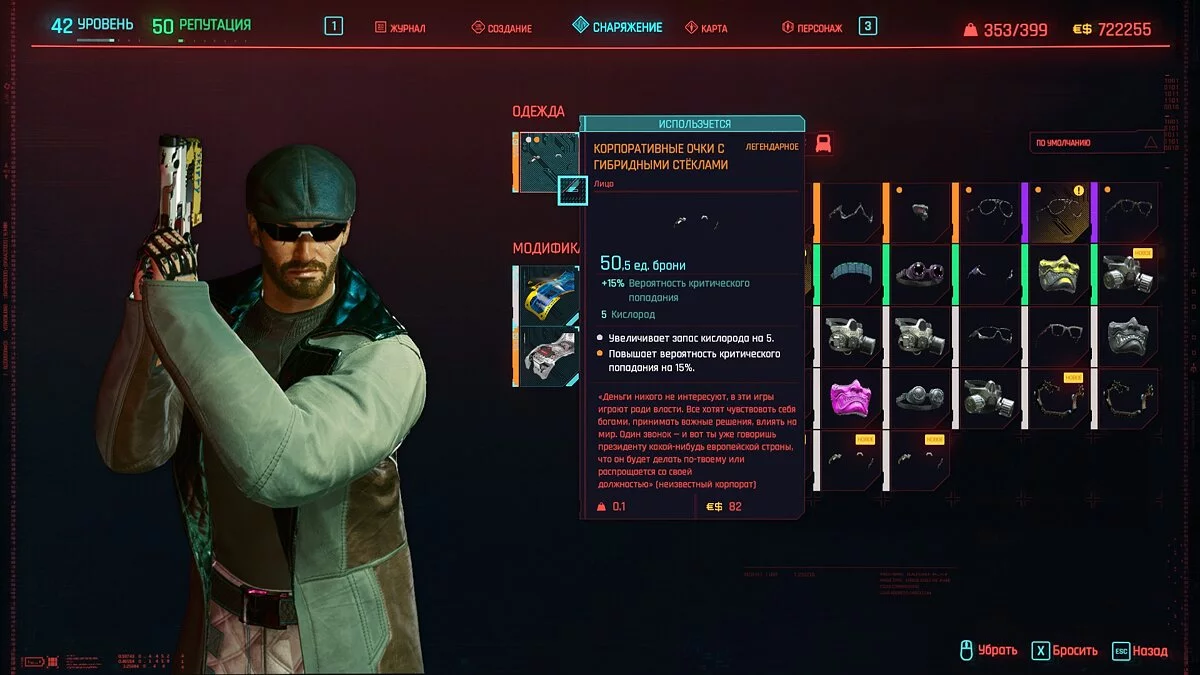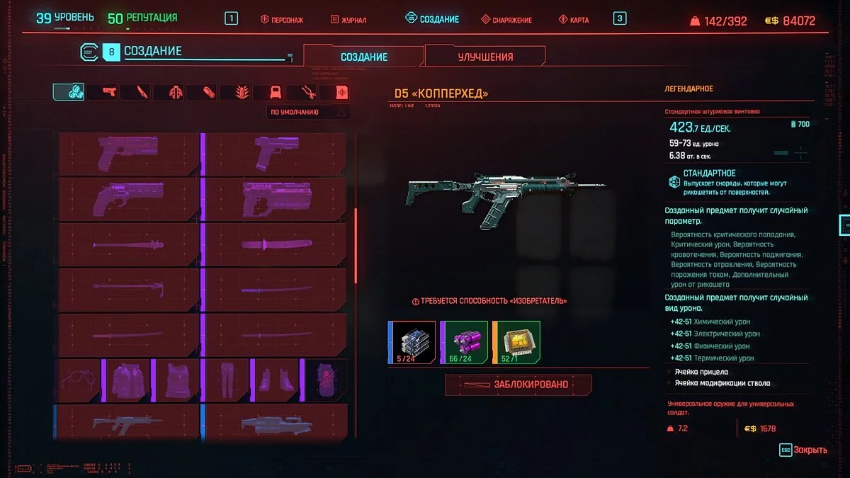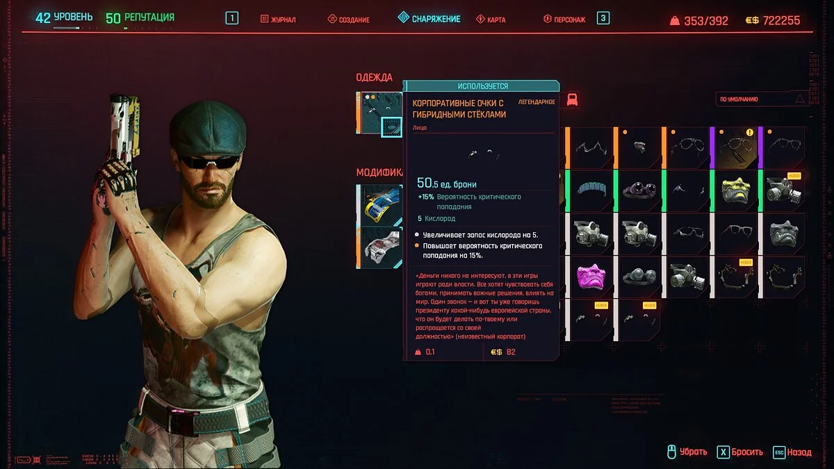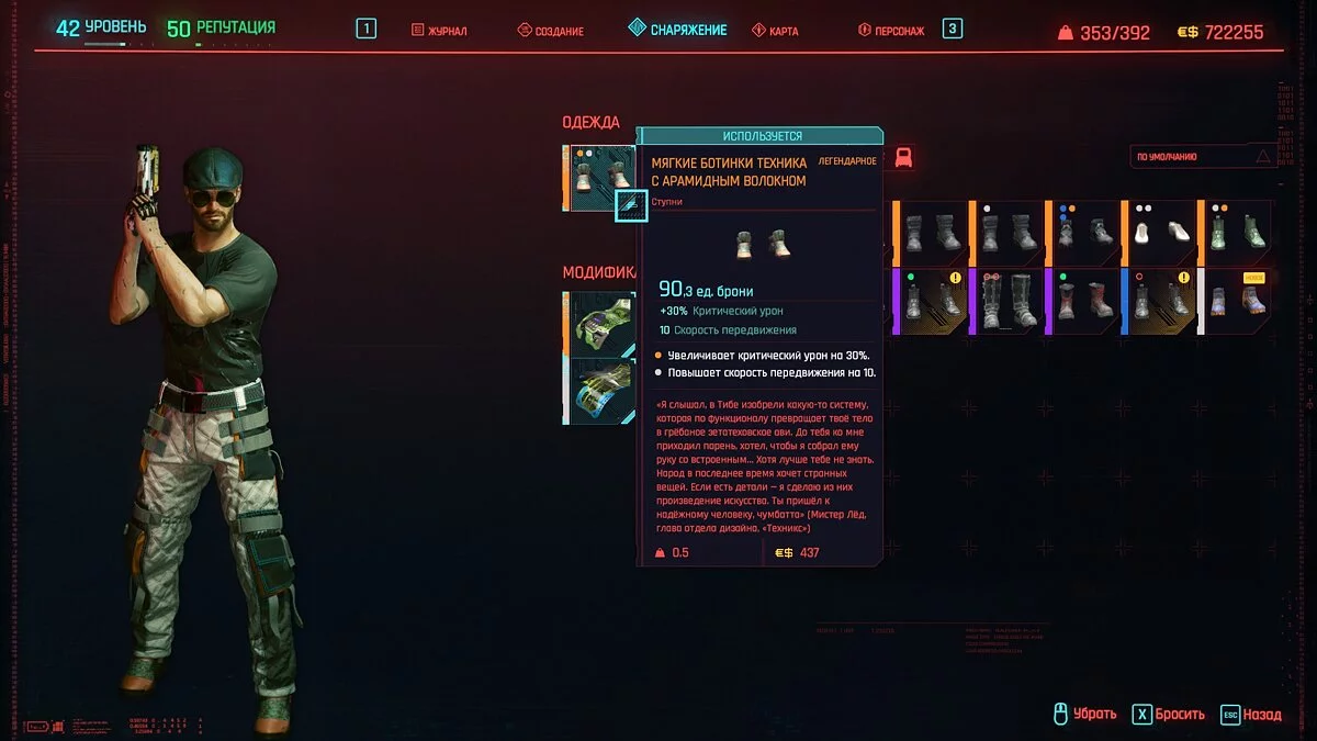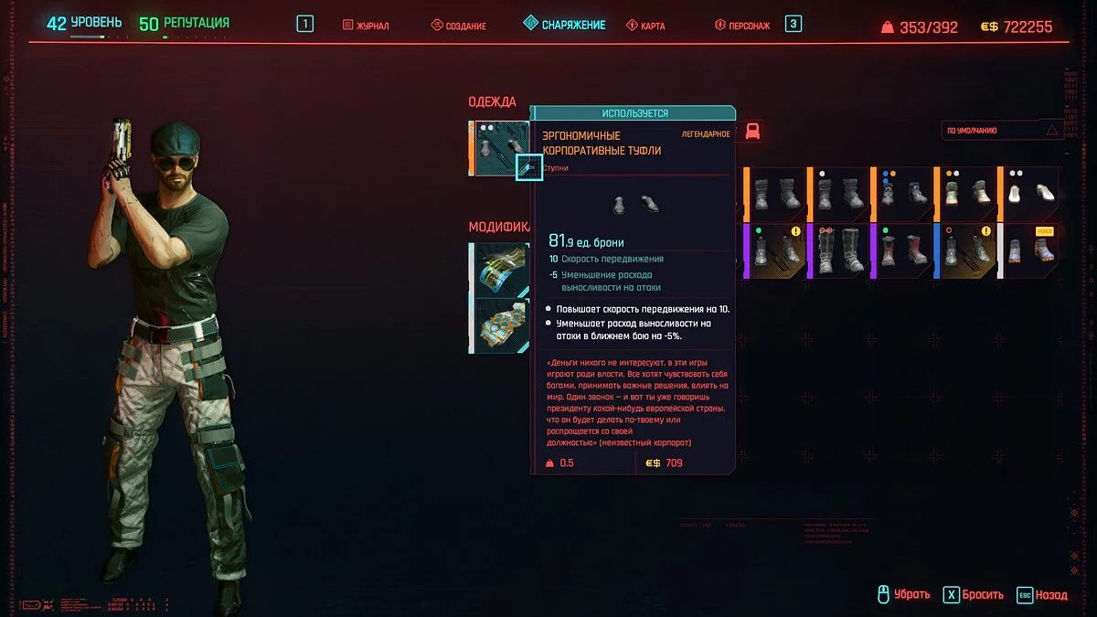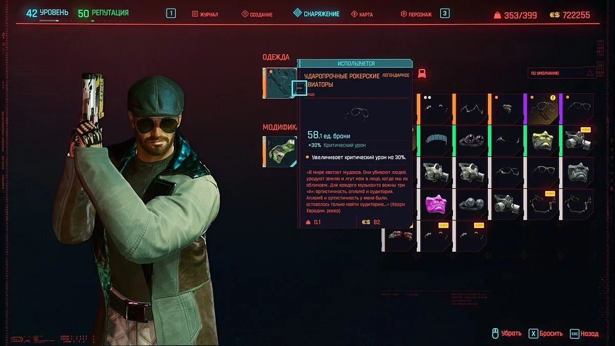 Вот мы получили максимально прокачанную вещь. Если по характеристикам она вам не подходит, но внешне очень нравится (мне, например, очень понравилась одежда Джонни), то переходим снова на вкладку «Создание» и ищем ваш предмет одежды, который есть на текущий момент. То есть, если у вас предмет редкий, то в меню крафта он будет «фиолетовым». Вам также понадобятся мелкие детали для создания новой версии брони. Зажимаем кнопку «Изготовить» и получаем новую улучшенную версию брони. Вы должны сразу понимать, что это будет совершенно новый тип одежды, который не будет внешне отличаться от предыдущего, но при этом может получить карманы для модификаций и измененные характеристики.