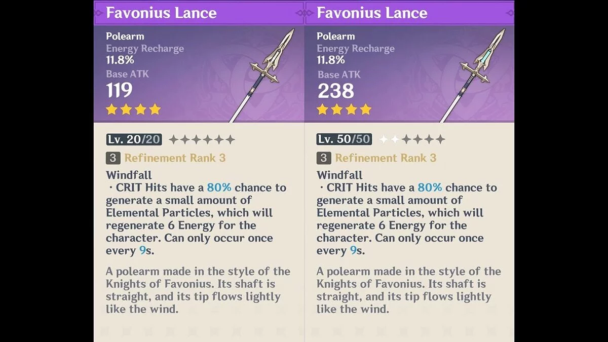 Оружие: копьё Фавония (Favonius Lance) — хорошая альтернатива, если она у вас есть. Немного слабее и не имеет критического усиления, но заряжает энергию еще быстрее.