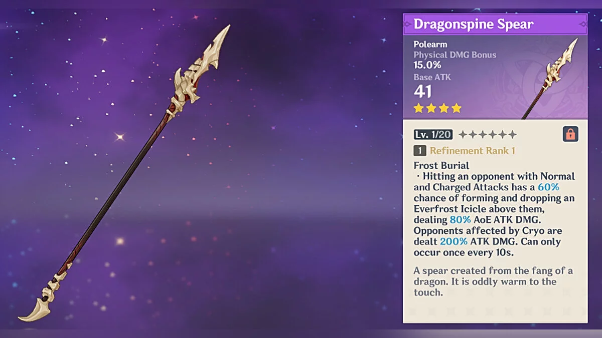 Копьё Драконьего хребта увеличивает весь физический урон и обладает особым заряженным эффектом. Заряженные атаки имеют высокий шанс создать большую сосульку над врагами, которая рушится и наносит 80-140% AoE-урона. Это число увеличивается до 200-360% урона, если противник поражен холодом, превращая Розарию в разрушительного ледяного убийцу. О том, как создать копьё Драконьего хребта вы можете прочитать в нашем гайде.