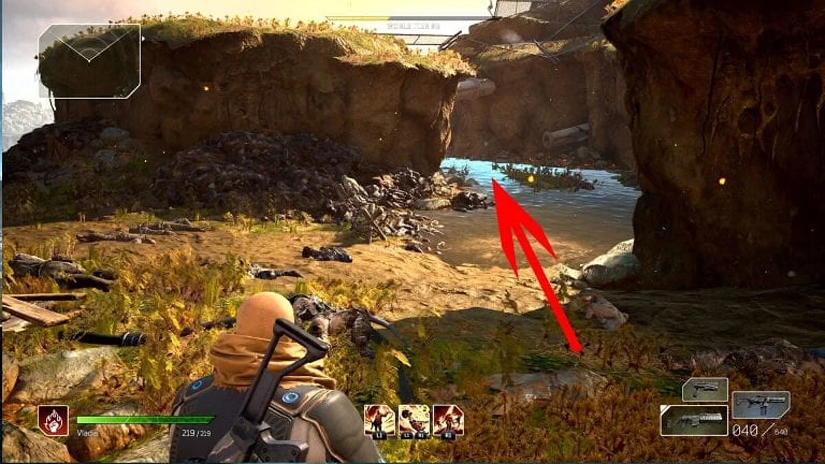 Обыщите его, затем развернитесь и спуститесь вниз с холма. Продолжайте двигаться вперёд, пока не увидите небольшое ущелье с водой (на скриншоте ниже).