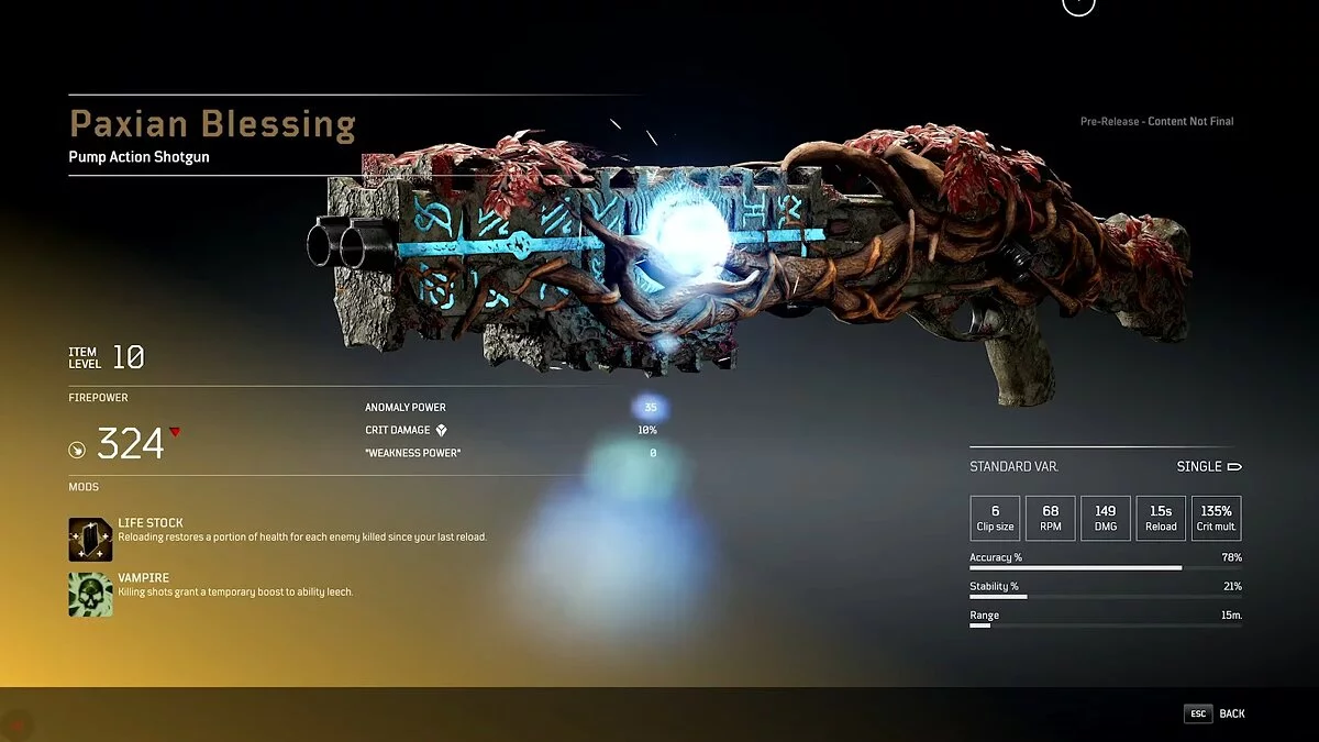 - Жизненный запас (Life Stock) — перезарядка восстанавливает здоровье за каждого убитого врага с момента последней перезарядки без смены вооружения;
