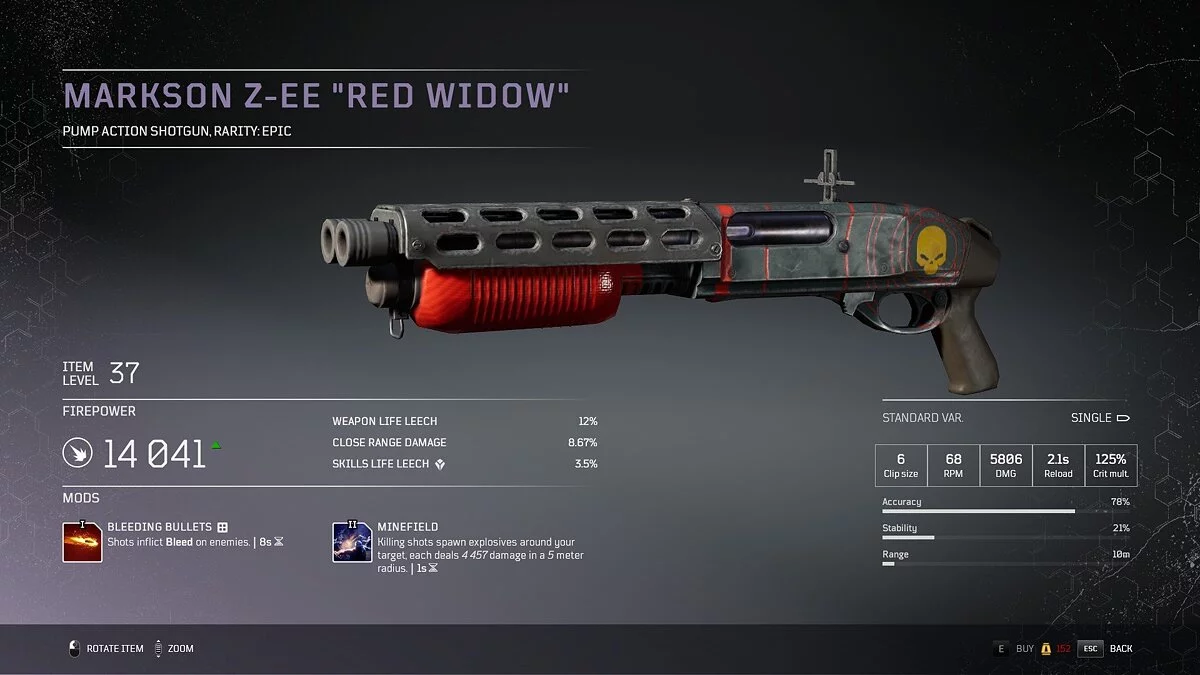 - Осколочная граната (Scrap Grenade) — первый выстрел после перезарядки превращается в аномальный снаряд, который наносит урон противникам в радиусе 5 метров, 1 секунда перезарядки;