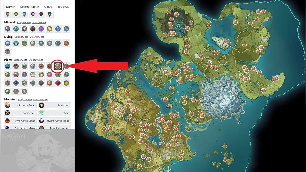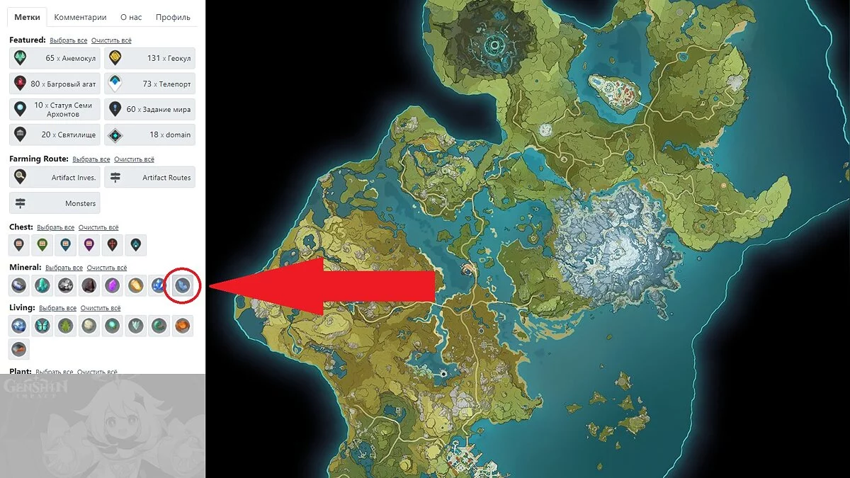 При желании вы можете воспользоваться интерактивной картой Genshin Impact самостоятельно. Для этого перейдите по этой ссылке. Вам нужно найти строчку «Минералы» (Minerals) и нажать на крайнюю иконку справа.