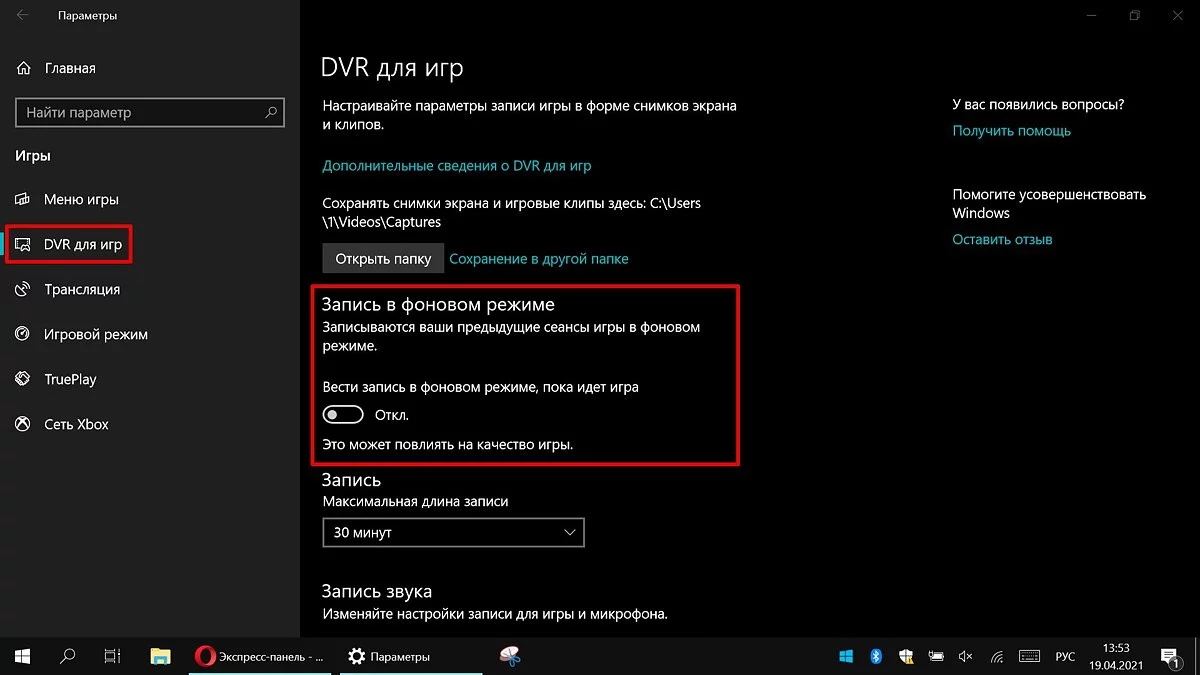 Далее перейдите в пункт «Игры». На левой панели выберите пункт «DVR для игр». Отключите ползунок «Вести запись для игр в фоновом режиме».