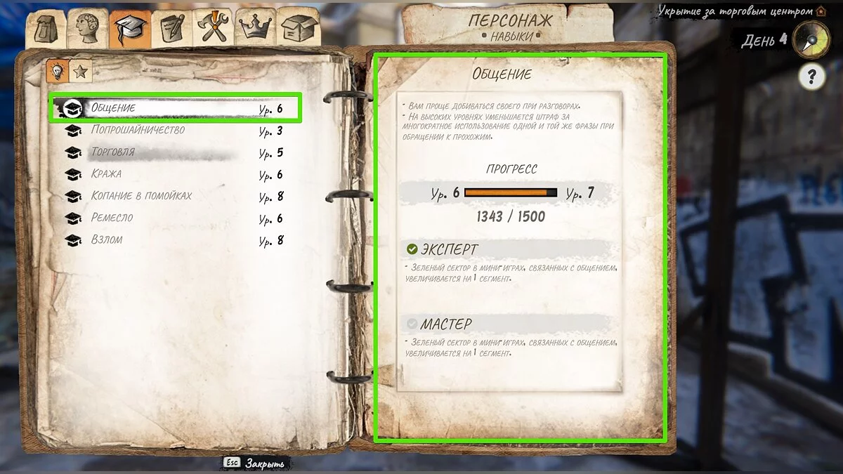 Прокачать навык можно просто общаясь с людьми, читая книги, а также улучшить навык у бездомного по кличке Шизик. Последний повысит уровень навыка до «Эксперта» или «Мастера» за 50 и 80 единиц доверия соответственно.
