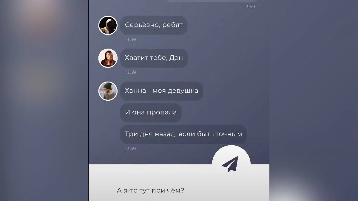 Получив сообщение, Томас попытался сразу же ей позвонить. Кто-то взял трубку, но ничего не сказал. Клео отправит в чат фотографию Ханны и попросит хорошенько подумать, почему с её пропавшего телефона отправили ваш номер.
