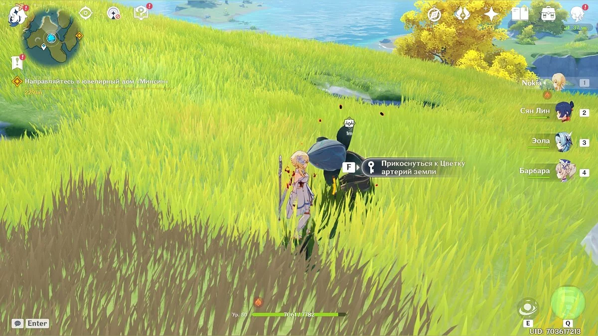 Откройте карту игры и найдите такой же значок, который указан на скриншоте выше. Используйте быстрое перемещение в область, где на данный момент находятся Цветы озарения и сразитесь с десятком врагов. После победы над монстрами взаимодействуйте с цветком и используйте первородную смолу, чтобы получить награду.