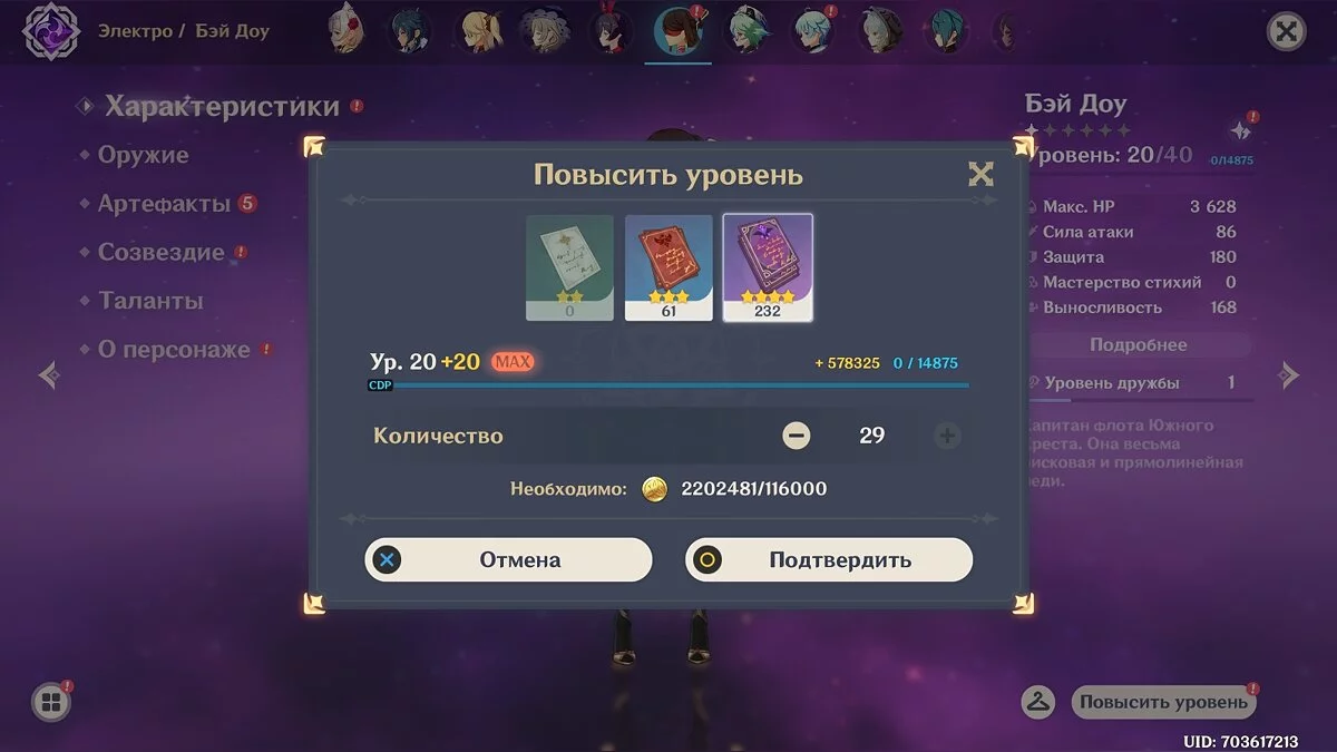 Чтобы использовать подобные предметы для получения опыта персонажа, достаточно открыть меню героев, выбрать нужного героя и нажать на кнопку «Повысить уровень» в правом нижнем углу экрана. Откроется окно, в котором игра предложит выбрать один из трёх доступных предметов для повышения уровня.