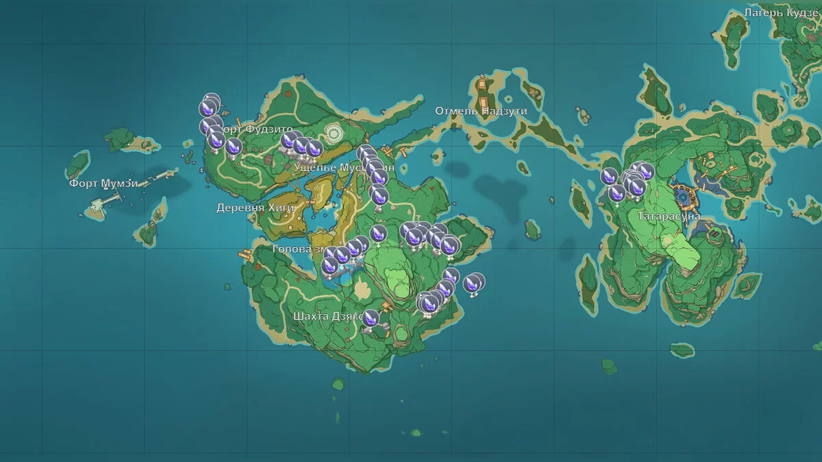 - Светящиеся грибы можно найти на Инадзуме, на острове Цуруми. Места, где их стоит искать, мы обозначили на карте: