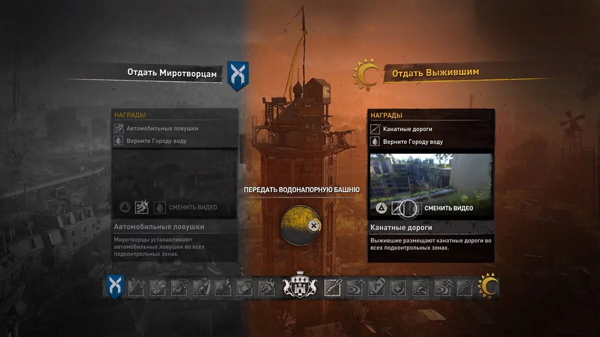 После того, как район будет под контролем, можно выбрать улучшение для города. Например, выжившие добавляют в свои районы различные приспособления для паркура, а миротворцы расставят ловушки для борьбы с зараженными. Помимо этого, у миротворцев есть уникальное оружие «арбалет». Что выбрать — решать исключительно вам.