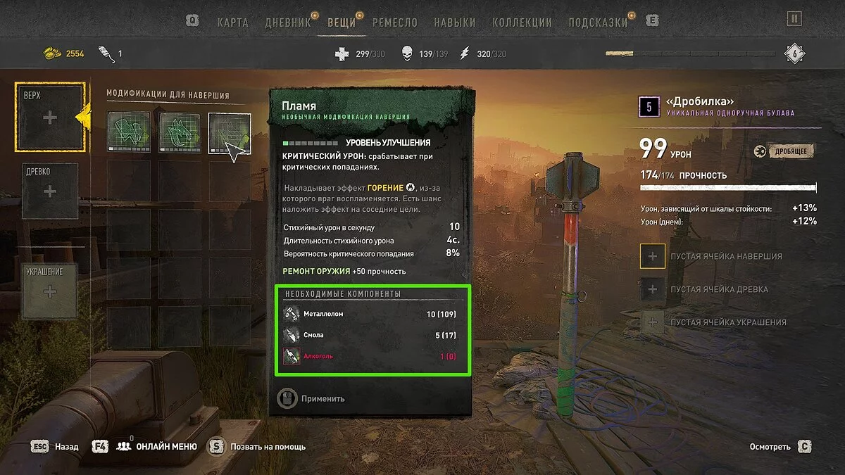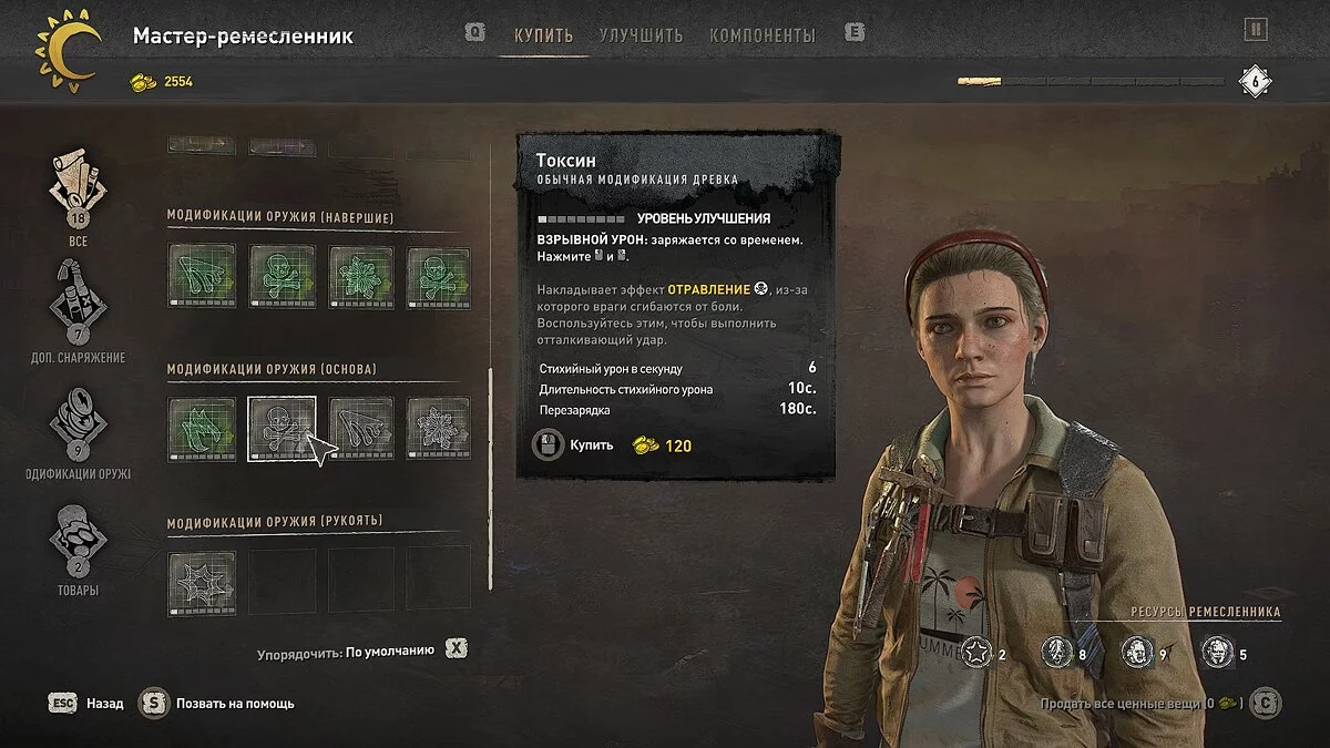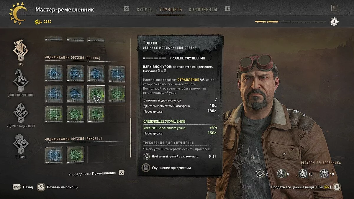 Для этого понадобятся «трофеи заражённых», но если вы предпочитаете избегать схватки с мертвяками, сбор таких ресурсов может стать настоящим испытанием. Например, чтобы улучшить модификации «Молния» или «Отрава» до второго уровня, вам придётся собрать 5 необычных трофеев с заражённых. В этом случае обязательно ознакомьтесь с нашим гайдом по трофеям, в котором мы подробно описали места обитания и тактику сражения с каждым монстром.