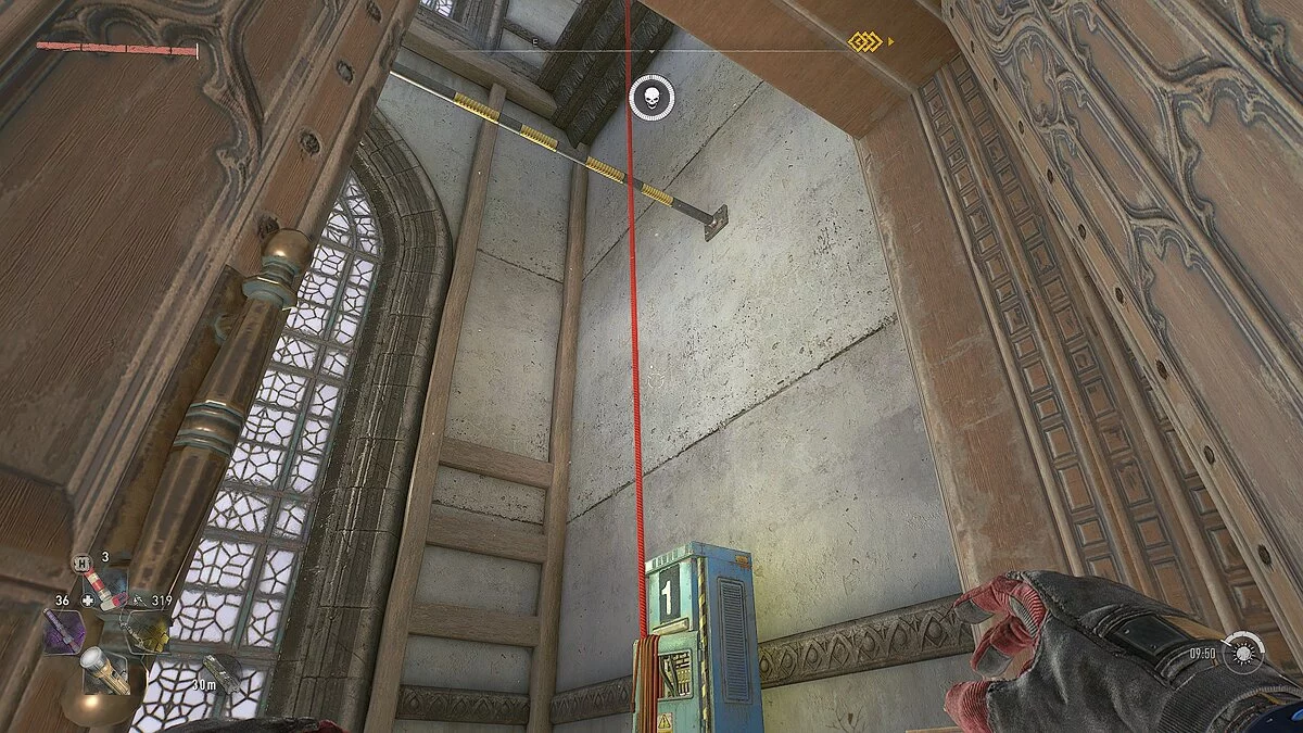 Добравшись до храма, найдите вход внутрь, поднимитесь наверх по деревянным балкам и войдите в здание. Здесь вы также увидите подъём выше, но сейчас он бесполезен. В главном зале убейте всех зомби и заберитесь на строительные леса у алтаря.