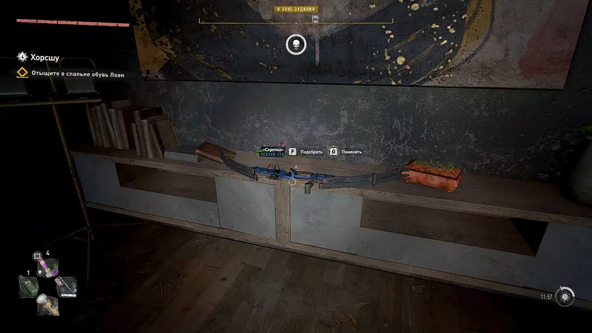 Более совершенный лук под названием «Скрепка» вы получите по ходу прохождения задания «Подкова» (он же «Хорсшу»). Зайдите в комнату, где вам нужно найти пару туфель и посмотрите на полку напротив кровати. На ней будет лежать лук.