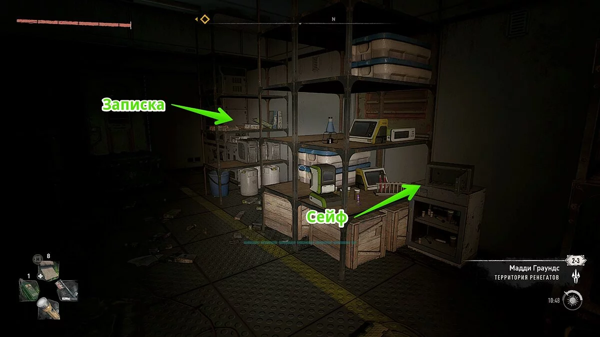 Вам нужно добраться до военного контейнера на пересечении двух регионов — Уорф и Мадди Граундс. Дверь открывается ключом ВГМ, а внутри вы найдёте записку с кодом и сейф. Код от сейфа — «10-10-10».