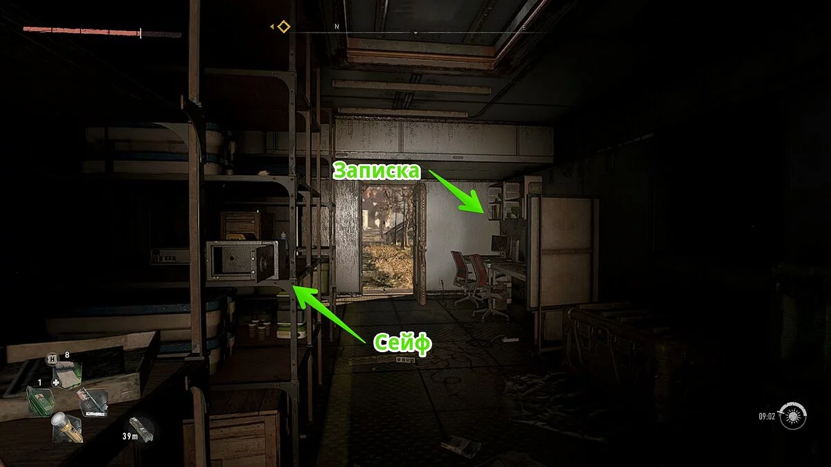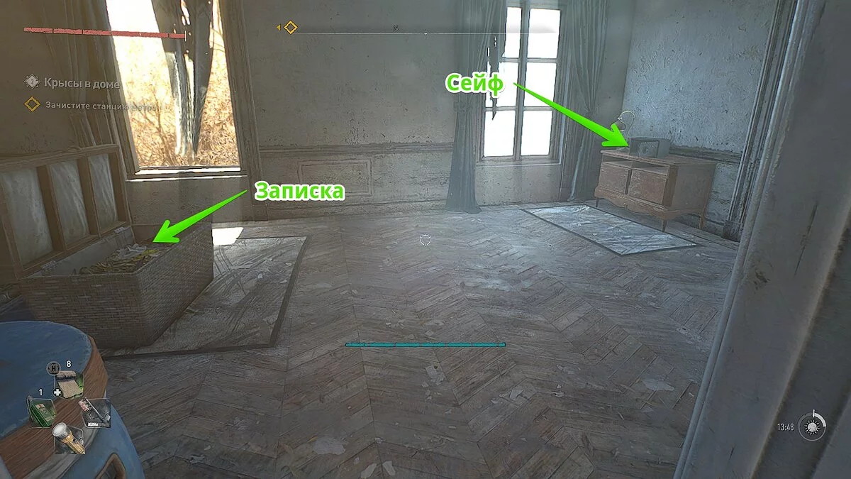 Первый предмет вы найдёте в двухэтажном доме на юге локации. Откройте ящик перед кроватью, чтобы найти записку с кодом (22-67-66).