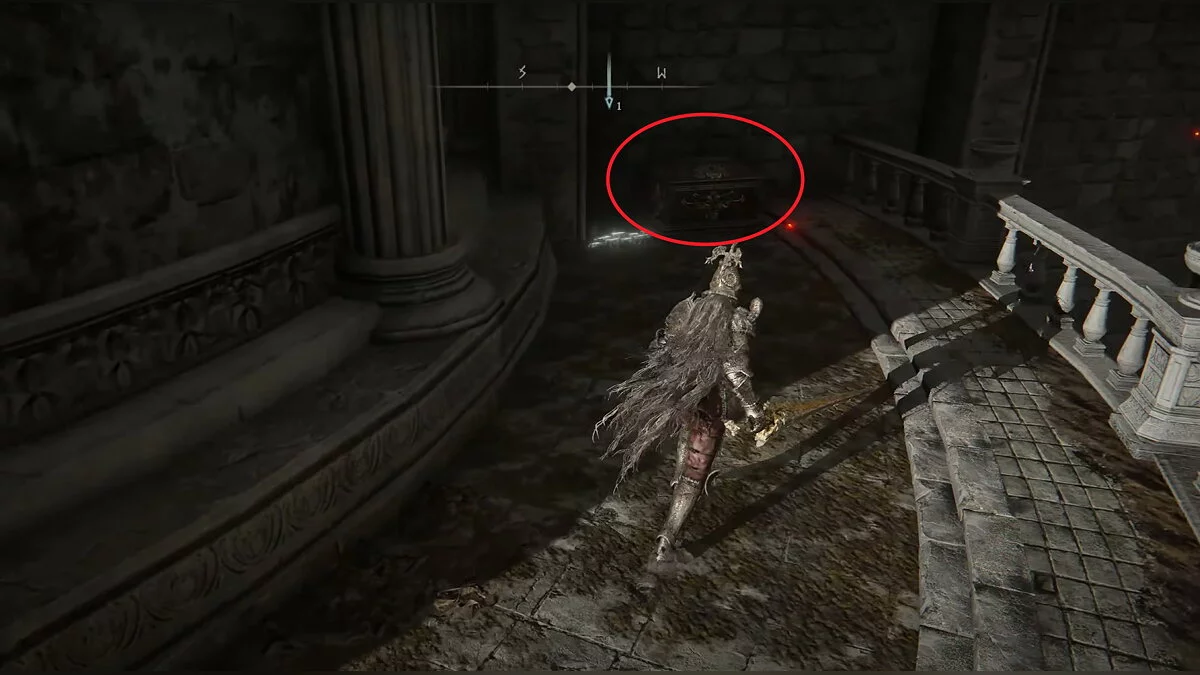 Воспользуйтесь лестницей, а затем поворачивайте налево и прыгайте на кусок стены, который парит в воздухе. Оттуда вы сможете добраться до лифта, но он вам не нужен. Обойдите его по кругу. Там вы увидите сундук, где и лежит комплект доспехов драконьего рыцаря.