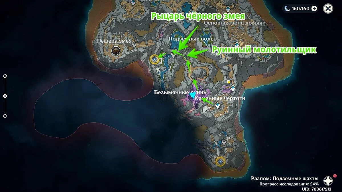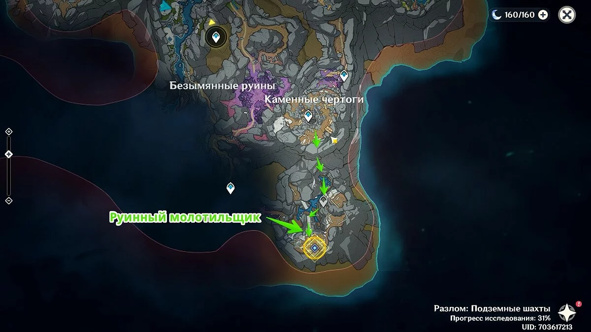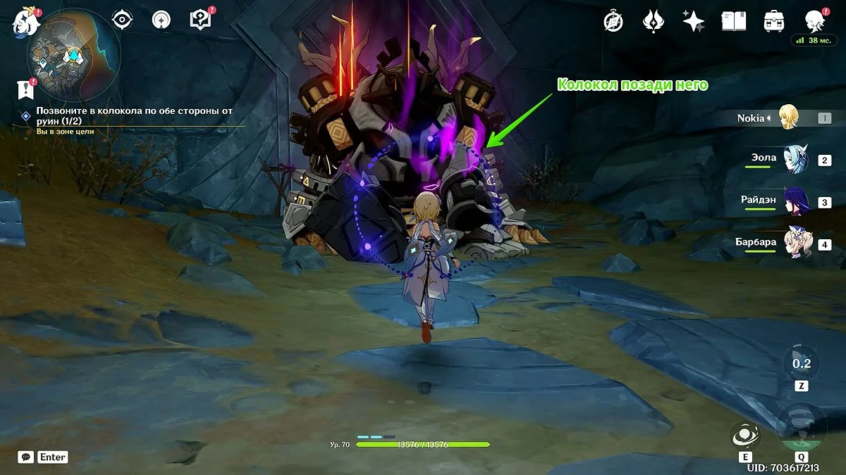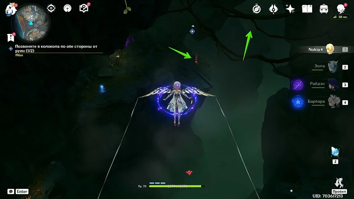 По квесту вам нужно найти два колокола и позвонить в них, чтобы развеять чёрный туман. Один из них находится на северо-западе локации, другой — на юго-востоке. Карта региона «Разлом» в Genshin Impact выполнена неудобно, так как в большинстве случаев непонятно, нужно спускаться глубже или, наоборот, подниматься наверх. Поэтому вы можете столкнуться с трудностями во время поиска правильного пути.