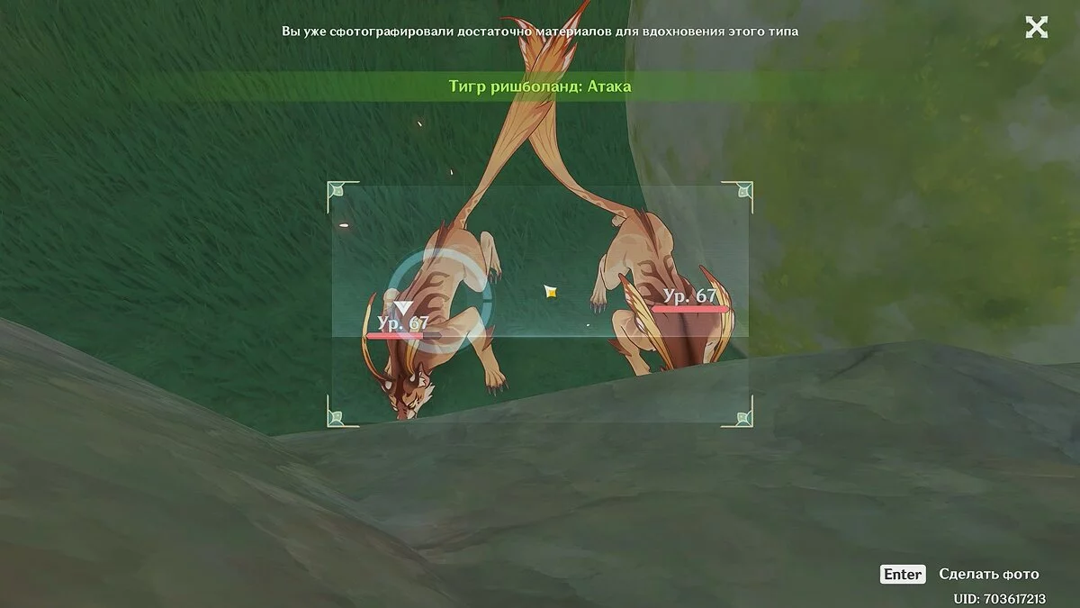 - Сфотографировать тигров ришболандов (все состояния): Черновики вдохновения (200), Мора (20 000), Указания о «Честности».