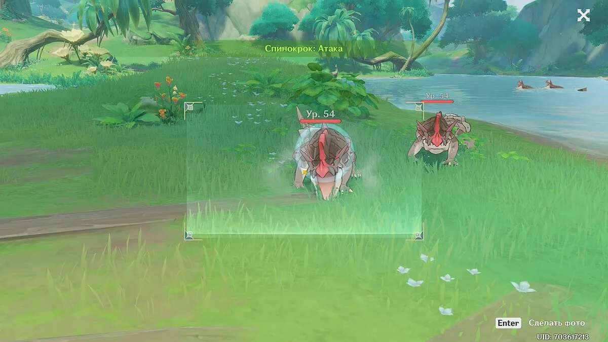 Телепортируйтесь к маркеру на карте и отыщите спинокроков. Сперва сфотографируйте атаку животного. Чтобы сделать это, подойдите к животному поближе, чтобы он попытался ударить его.