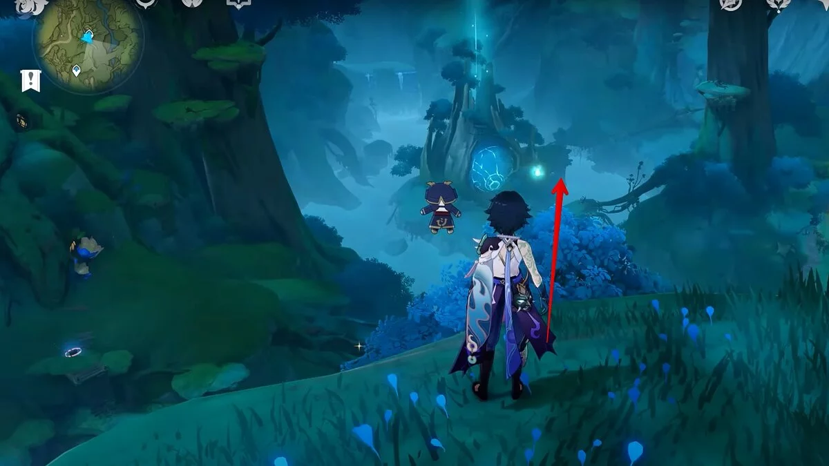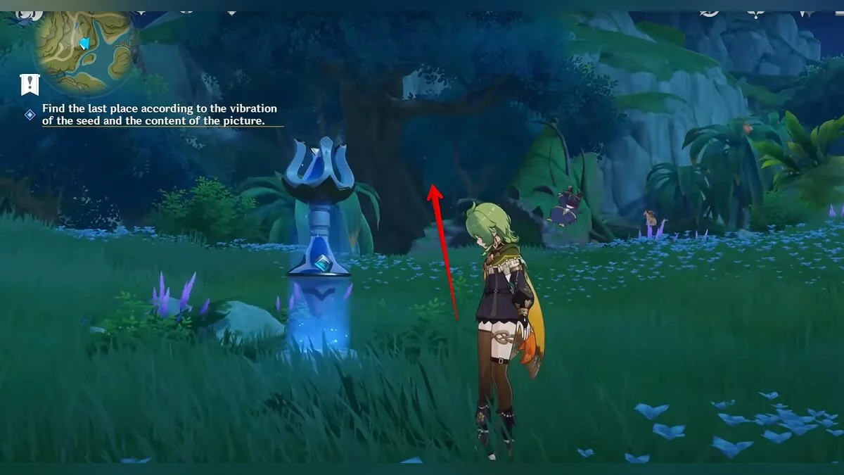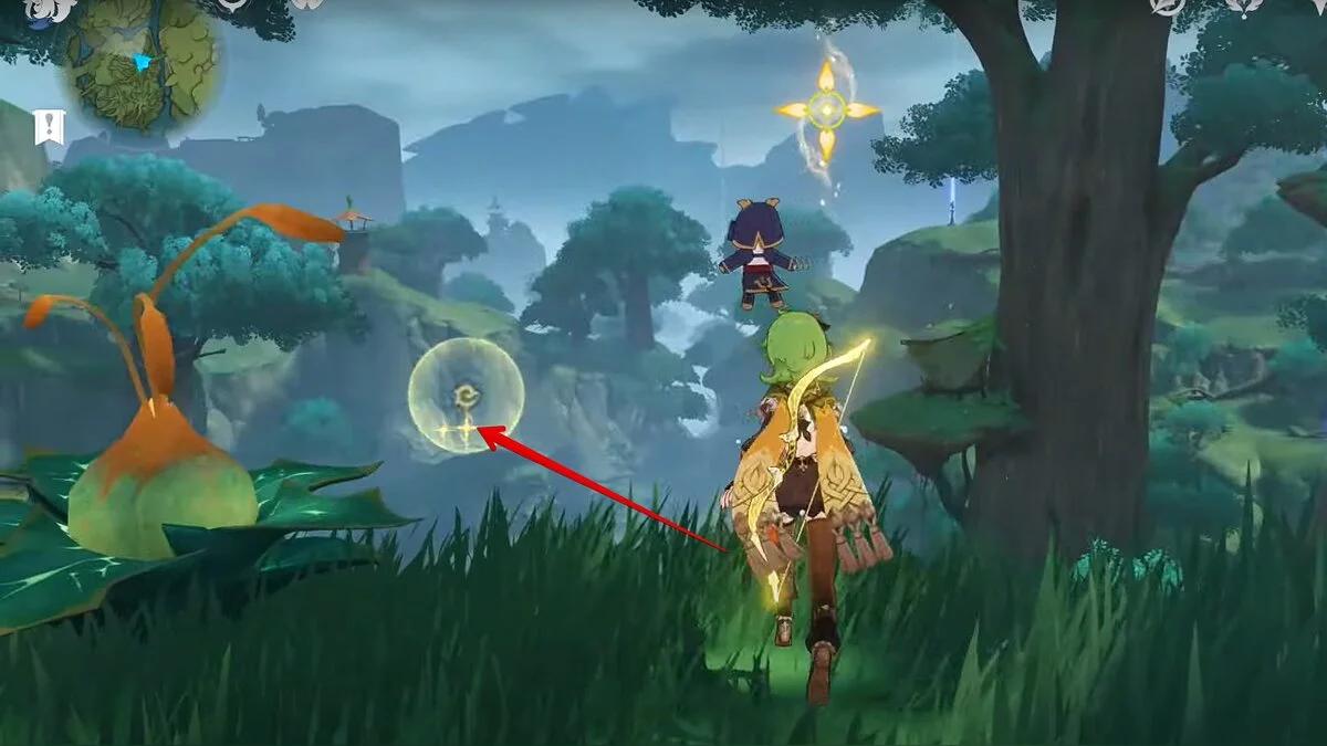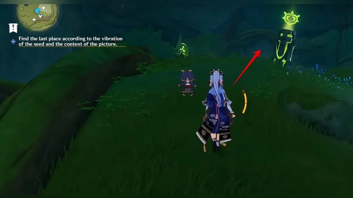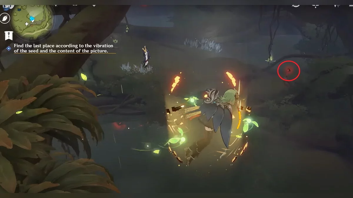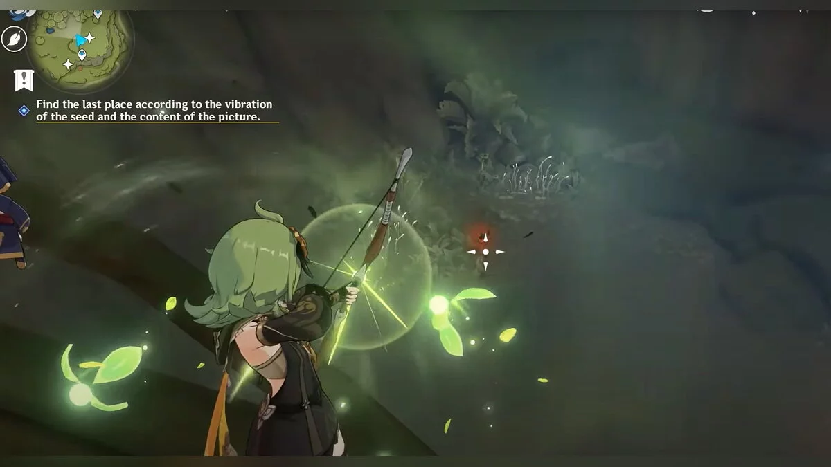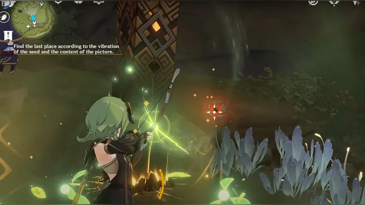 Для решения этой загадки вам потребуется Дендро-персонаж. Двигайтесь к точке на карте.