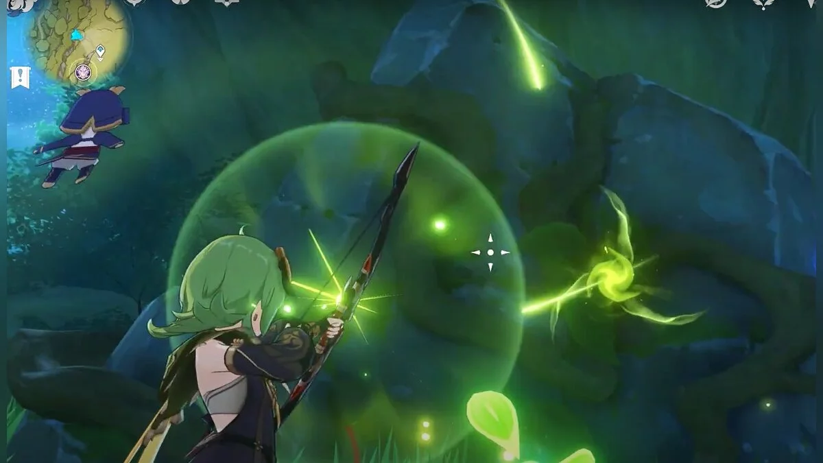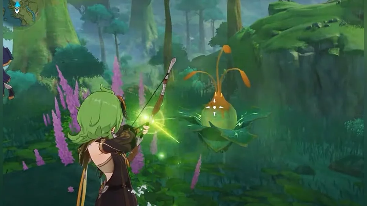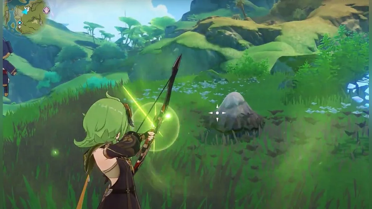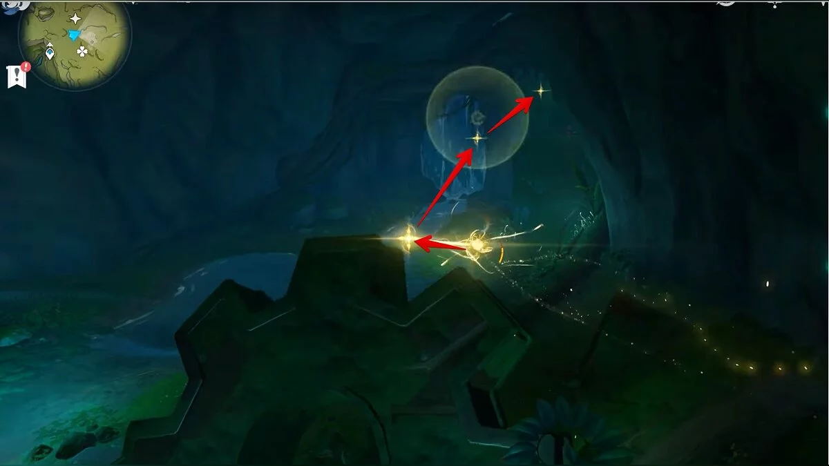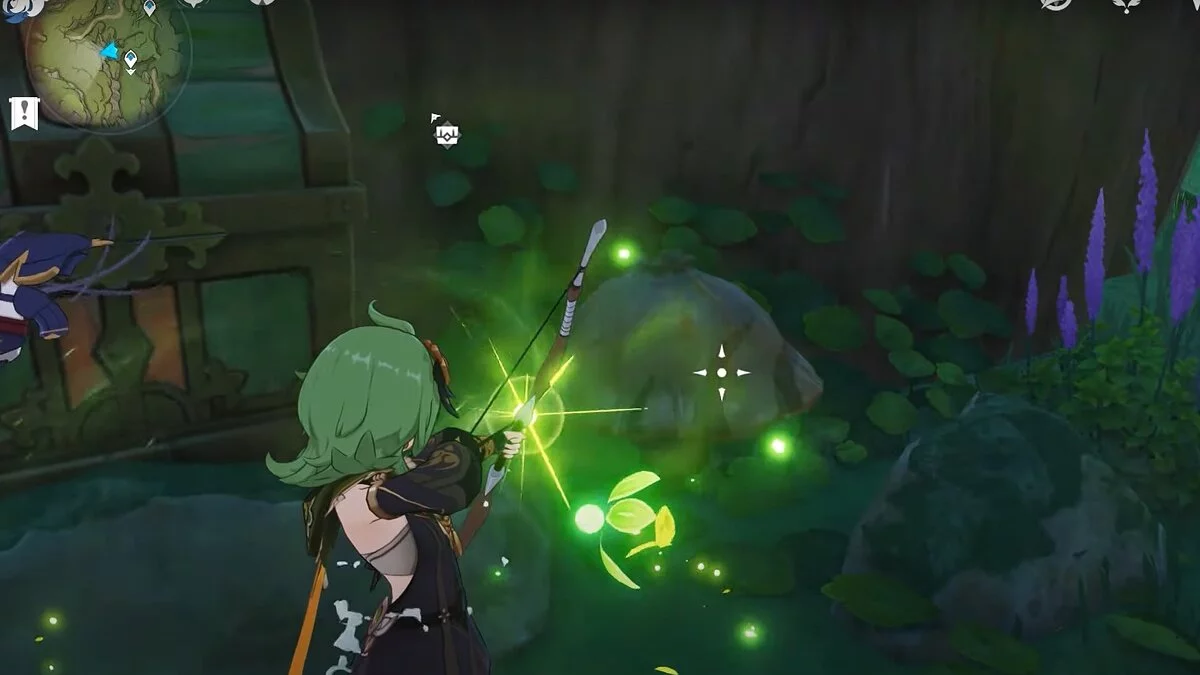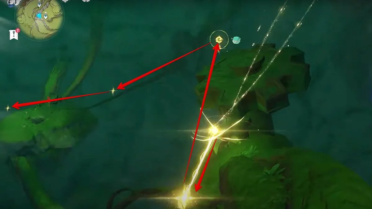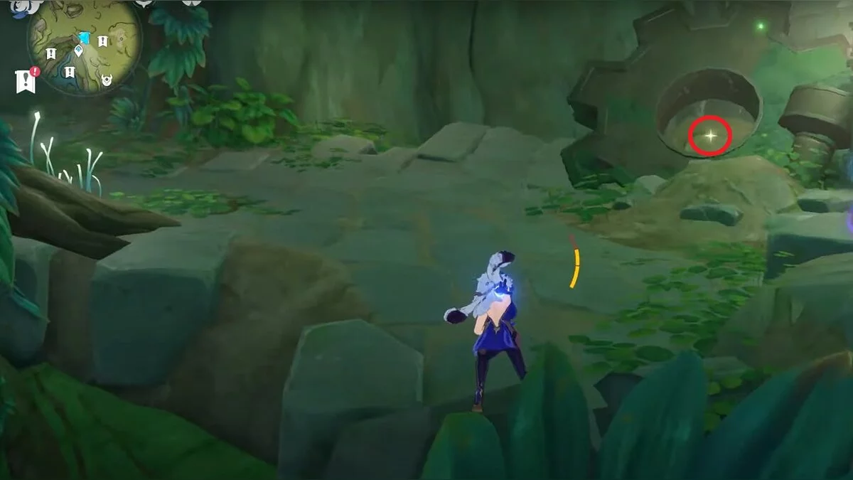 Здесь вам предстоит решить несложную головоломку. Переключитесь на Дендро-персонажа или возьмите дендрогранум, затем выстрелите по камню, который обвит лианами. Теперь вам нужно поразить мишени справа и слева от него.