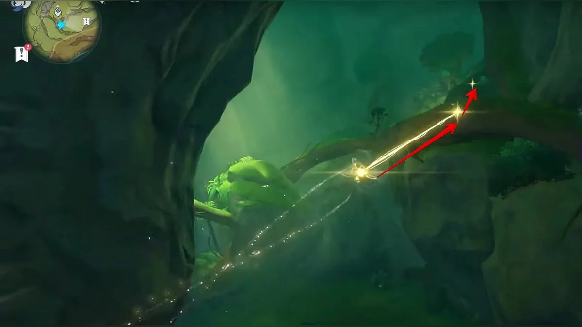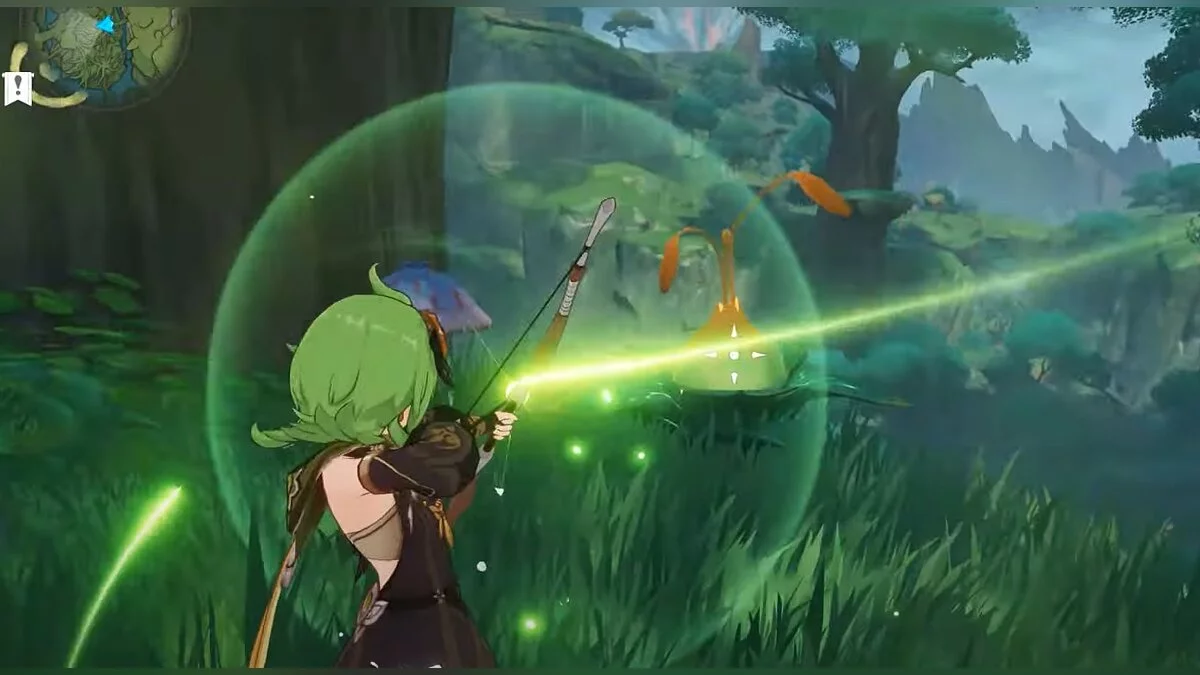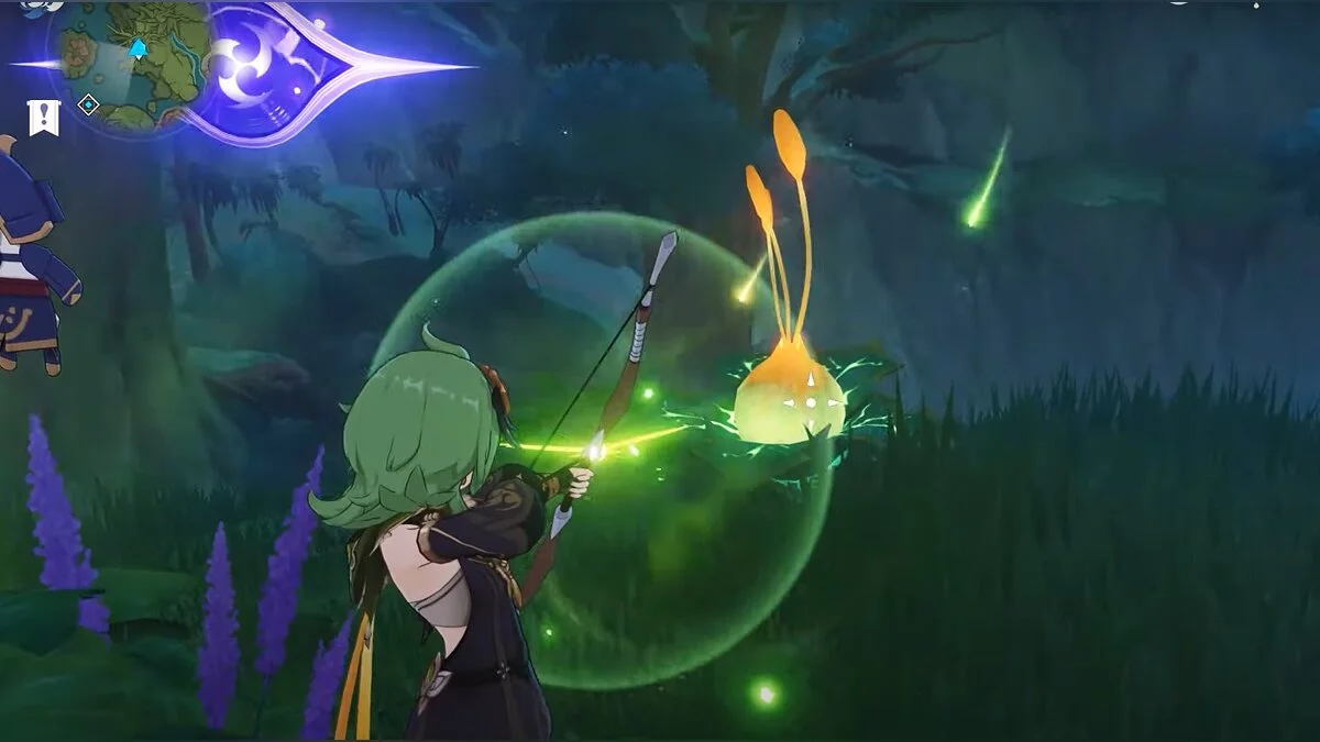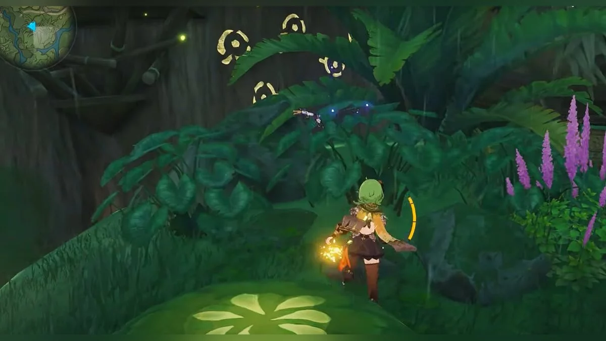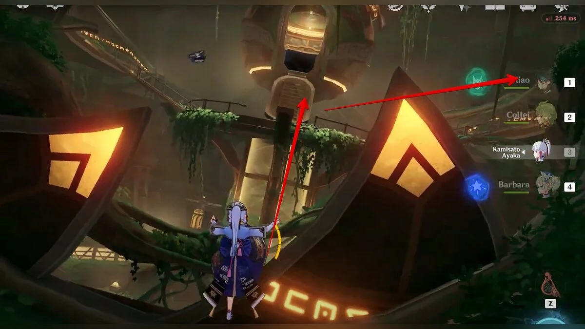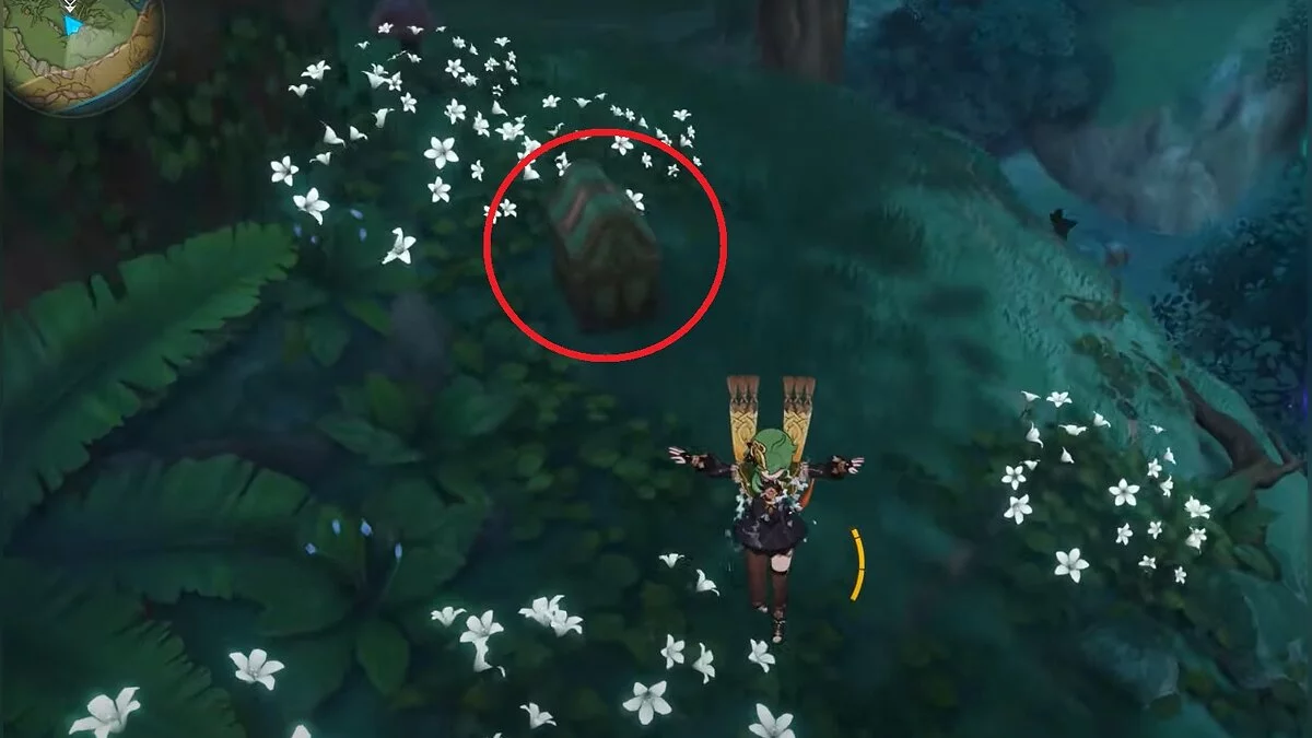 Здесь вам предстоит решить несложную головоломку. Переключитесь на Дендро-персонажа или возьмите дендрогранум, затем выстрелите по камню, который обвит лианами. Теперь вам нужно поразить мишени справа и слева от него.