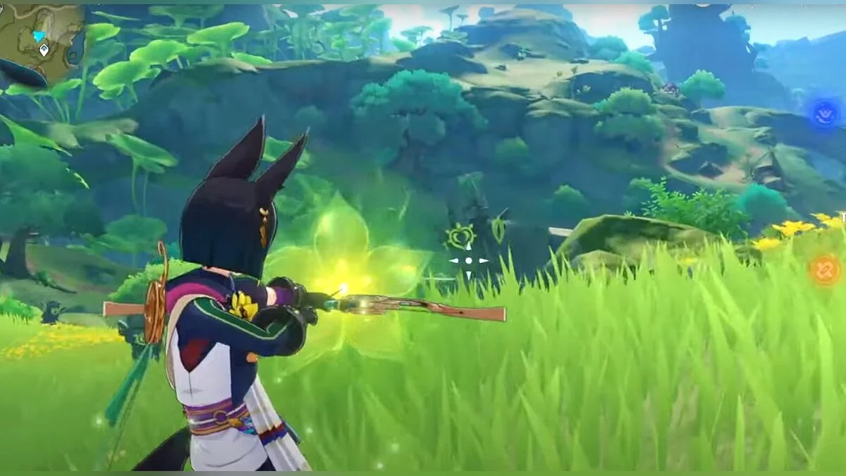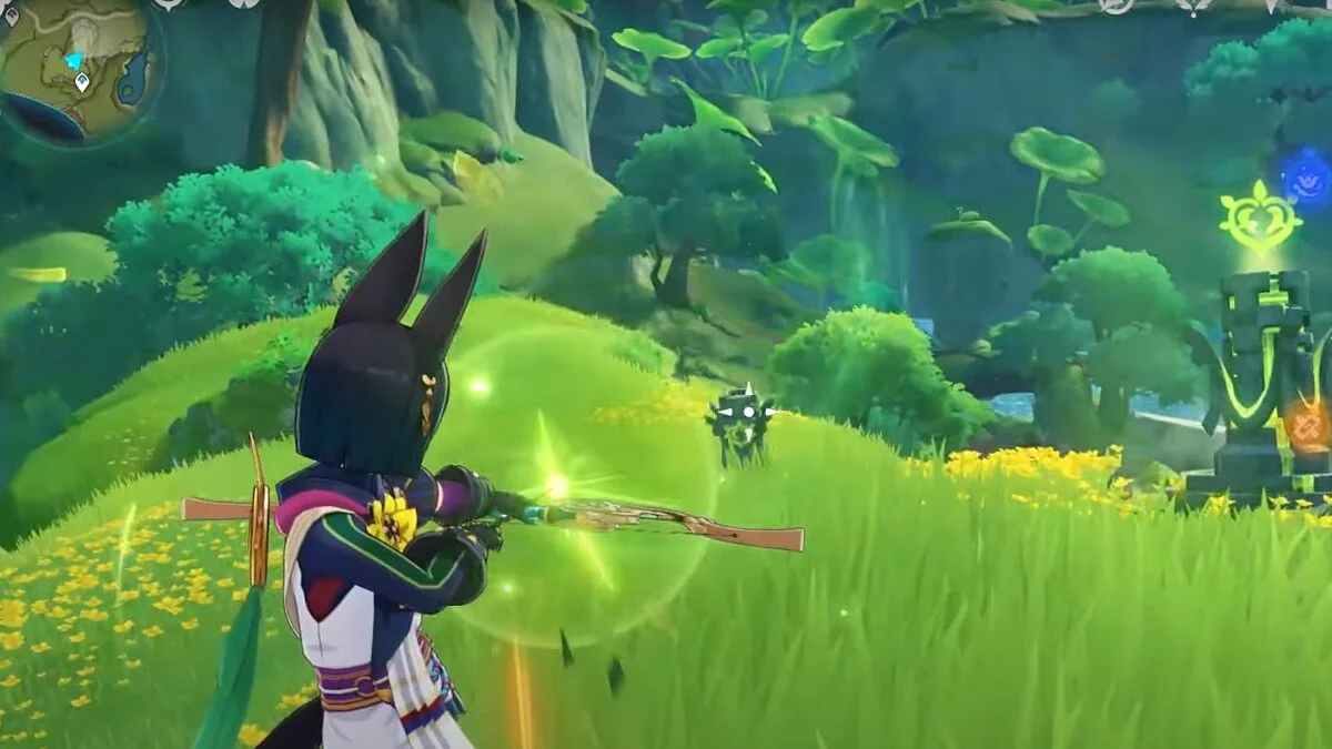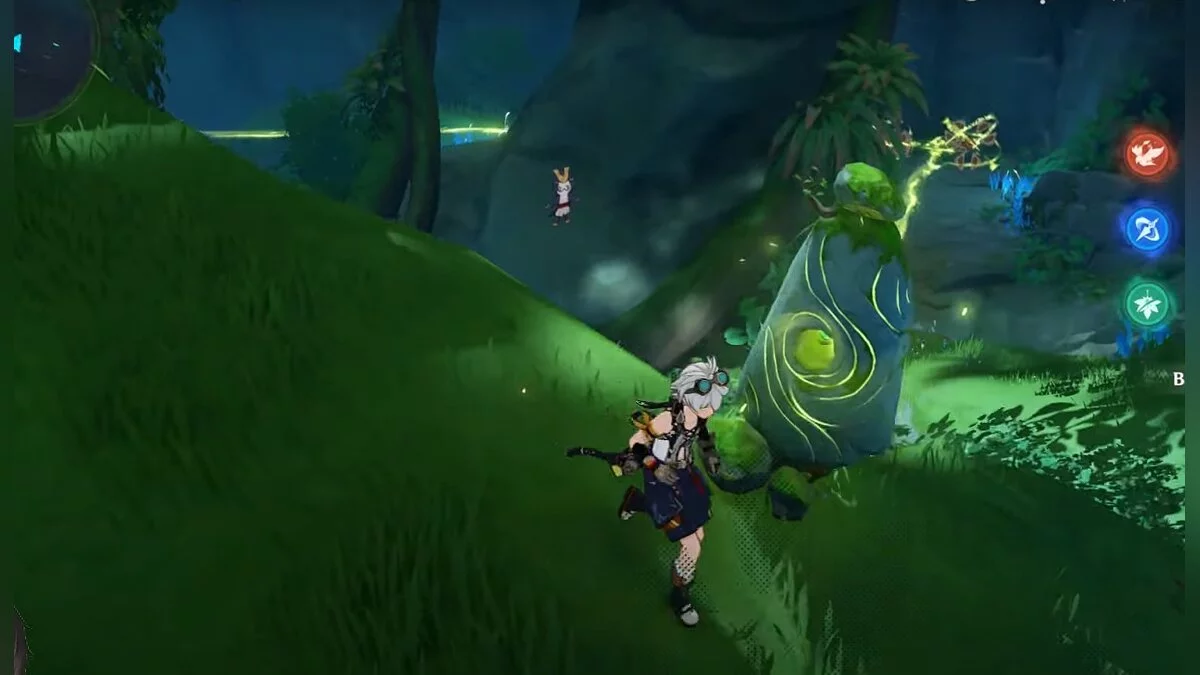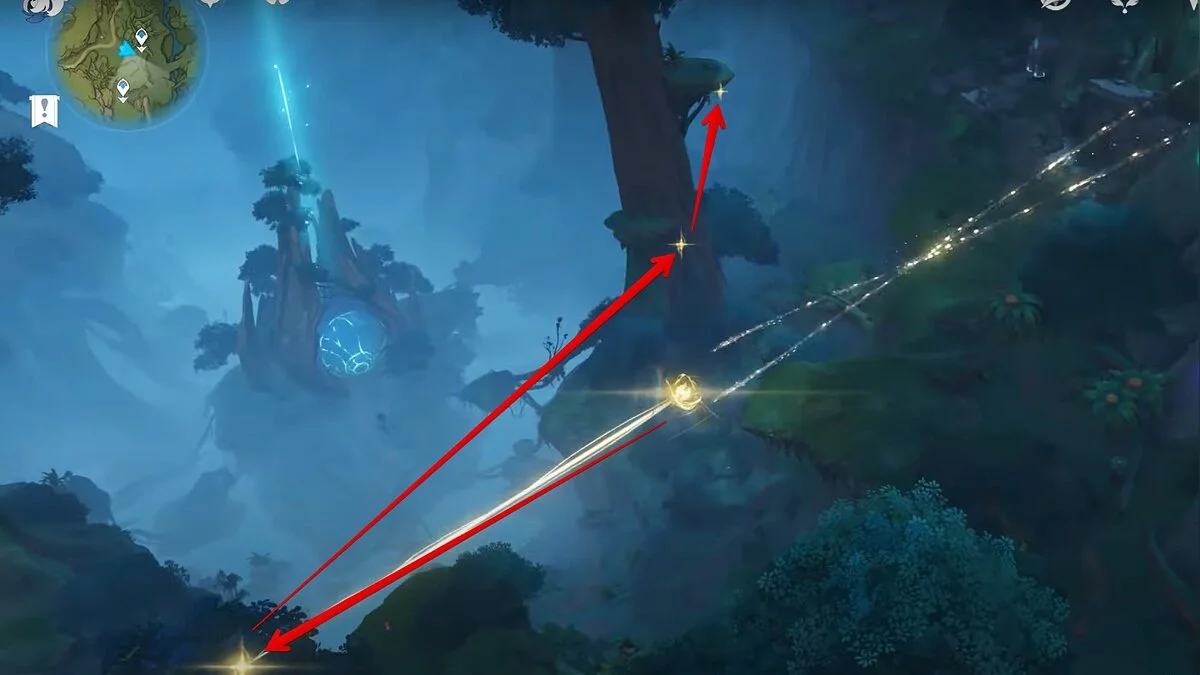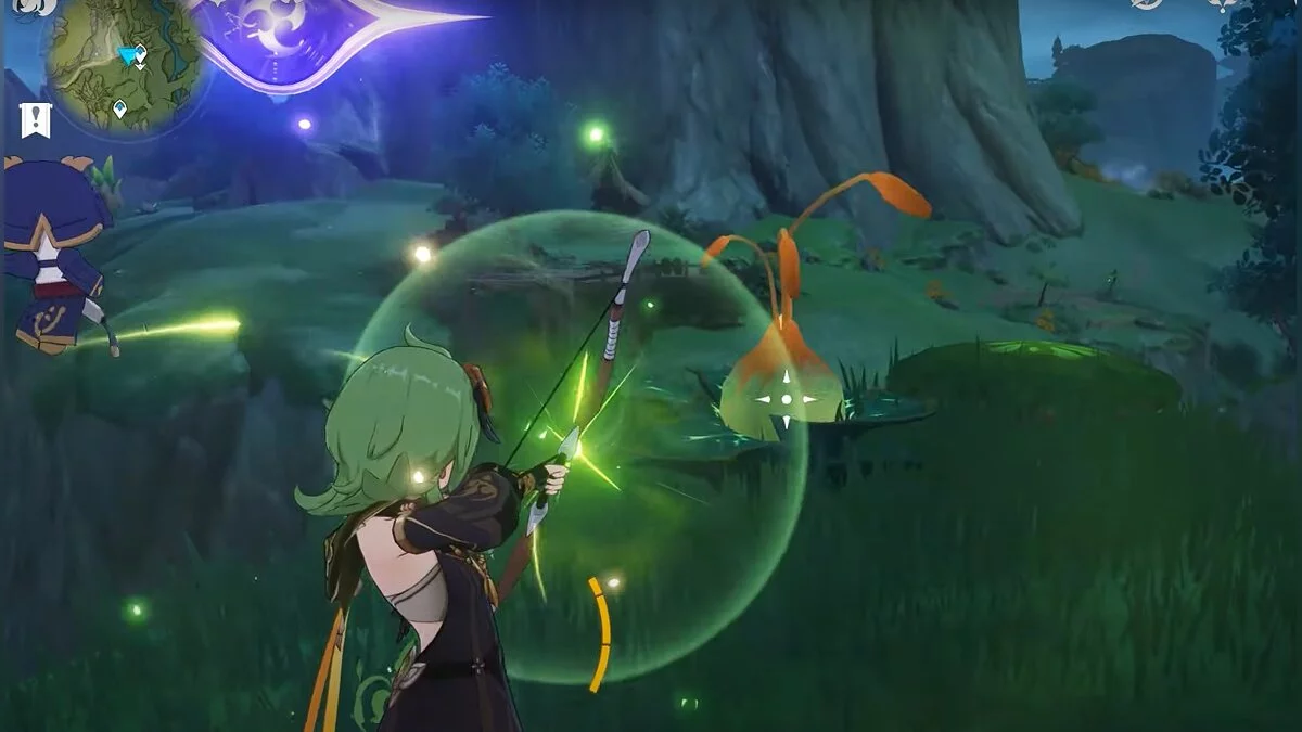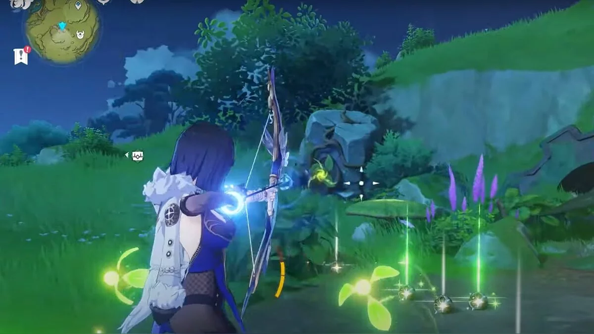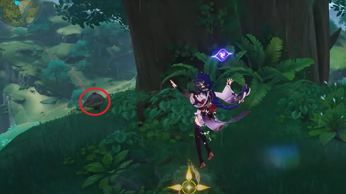 Здесь вам предстоит решить несложную головоломку. Переключитесь на Дендро-персонажа или возьмите дендрогранум, затем выстрелите по камню, который обвит лианами. Теперь вам нужно поразить мишени справа и слева от него.