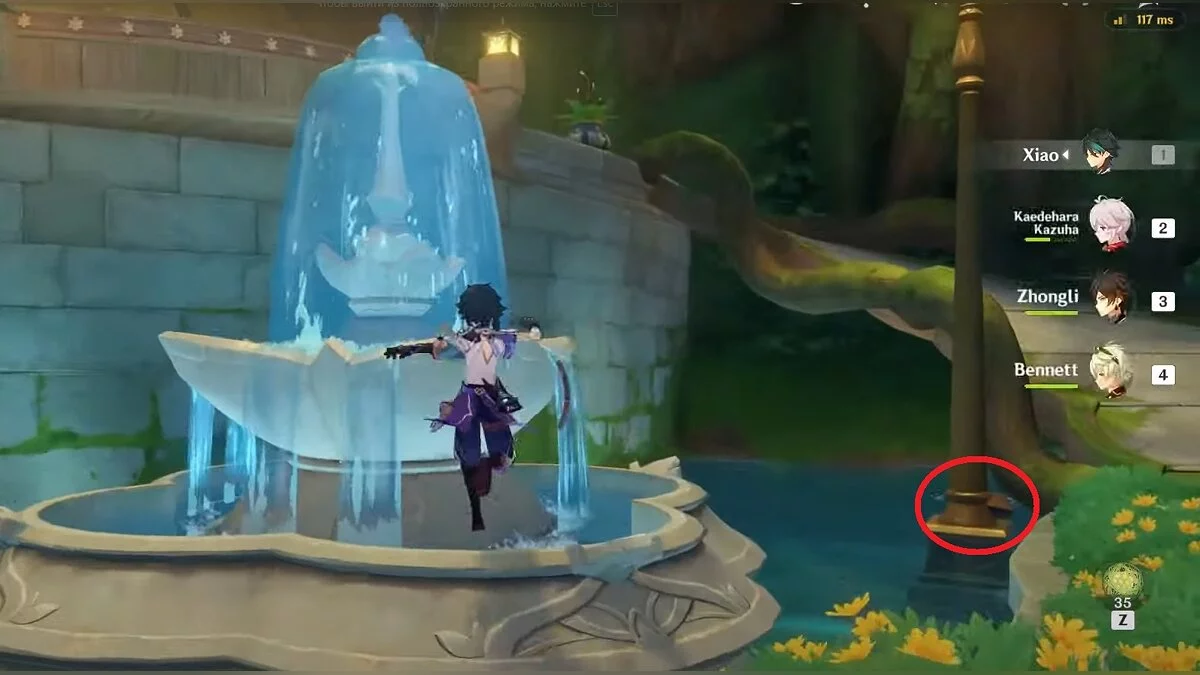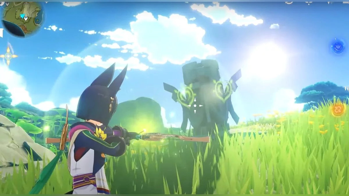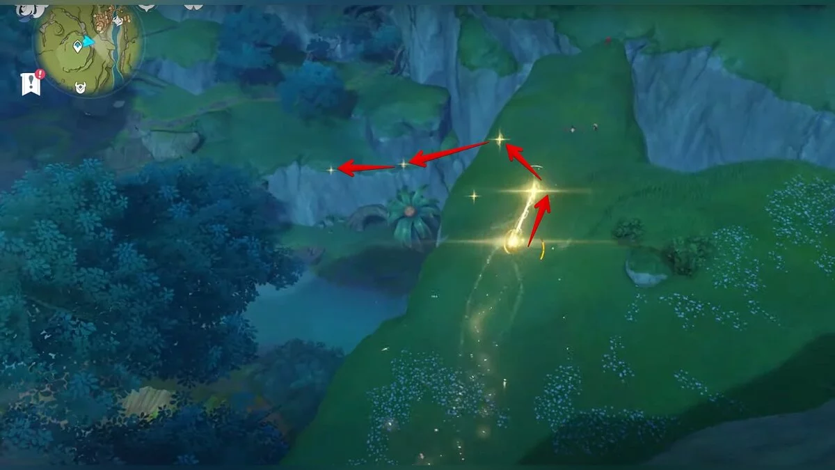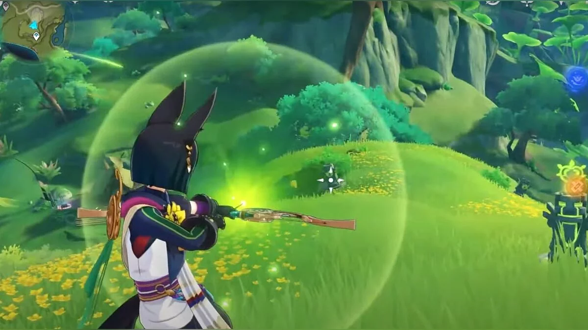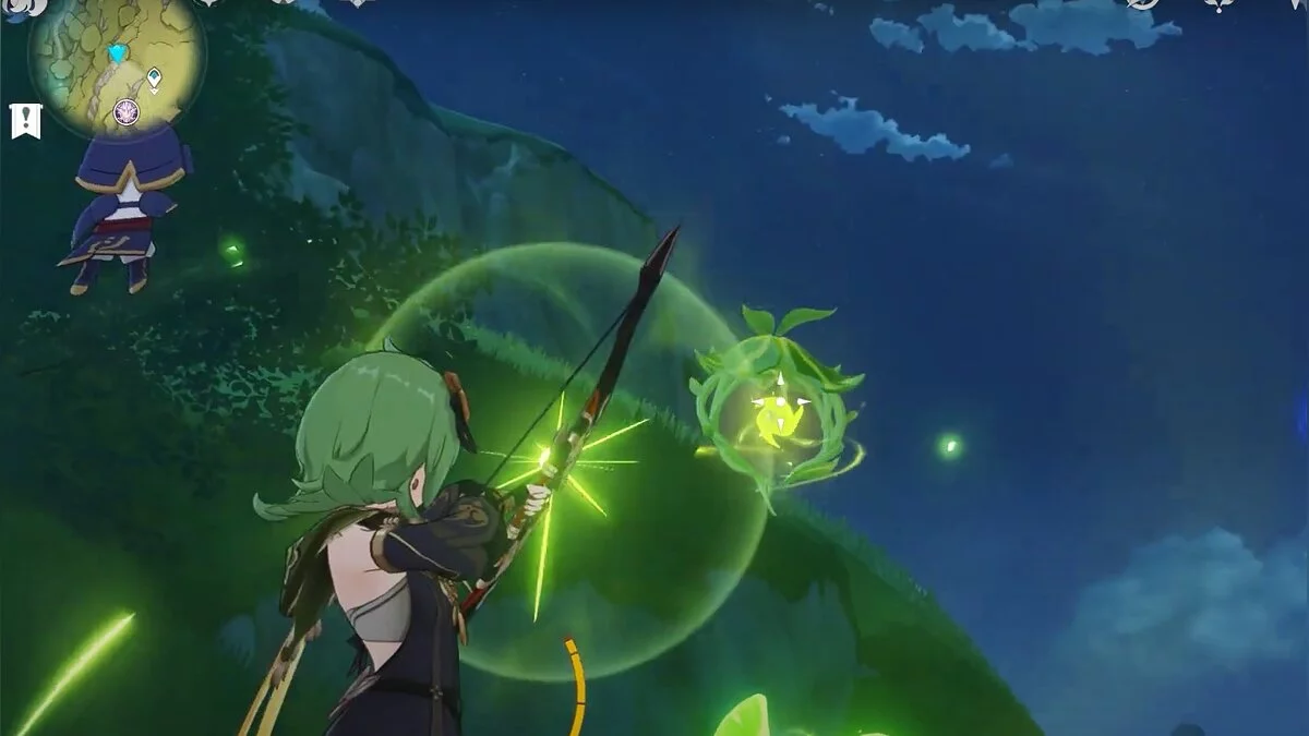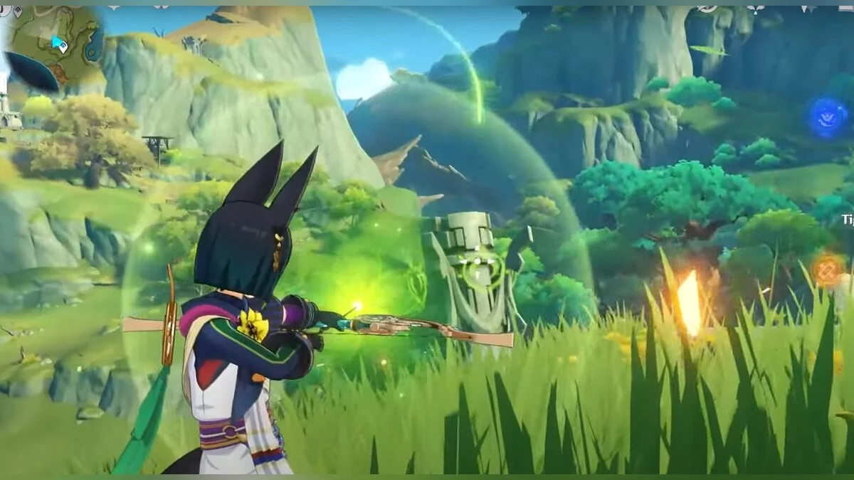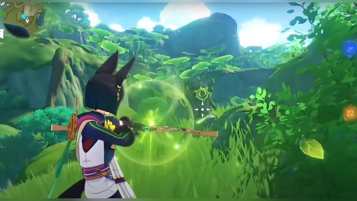 Здесь вам предстоит решить несложную головоломку. Переключитесь на Дендро-персонажа или возьмите дендрогранум, затем выстрелите по камню, который обвит лианами. Теперь вам нужно поразить мишени справа и слева от него.