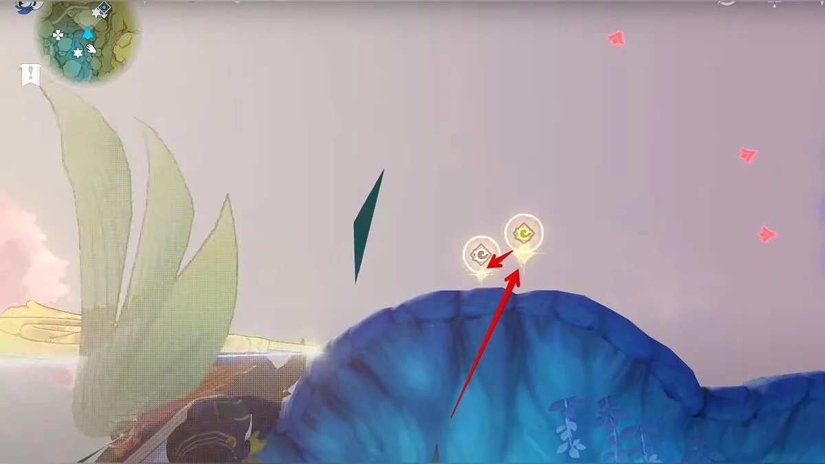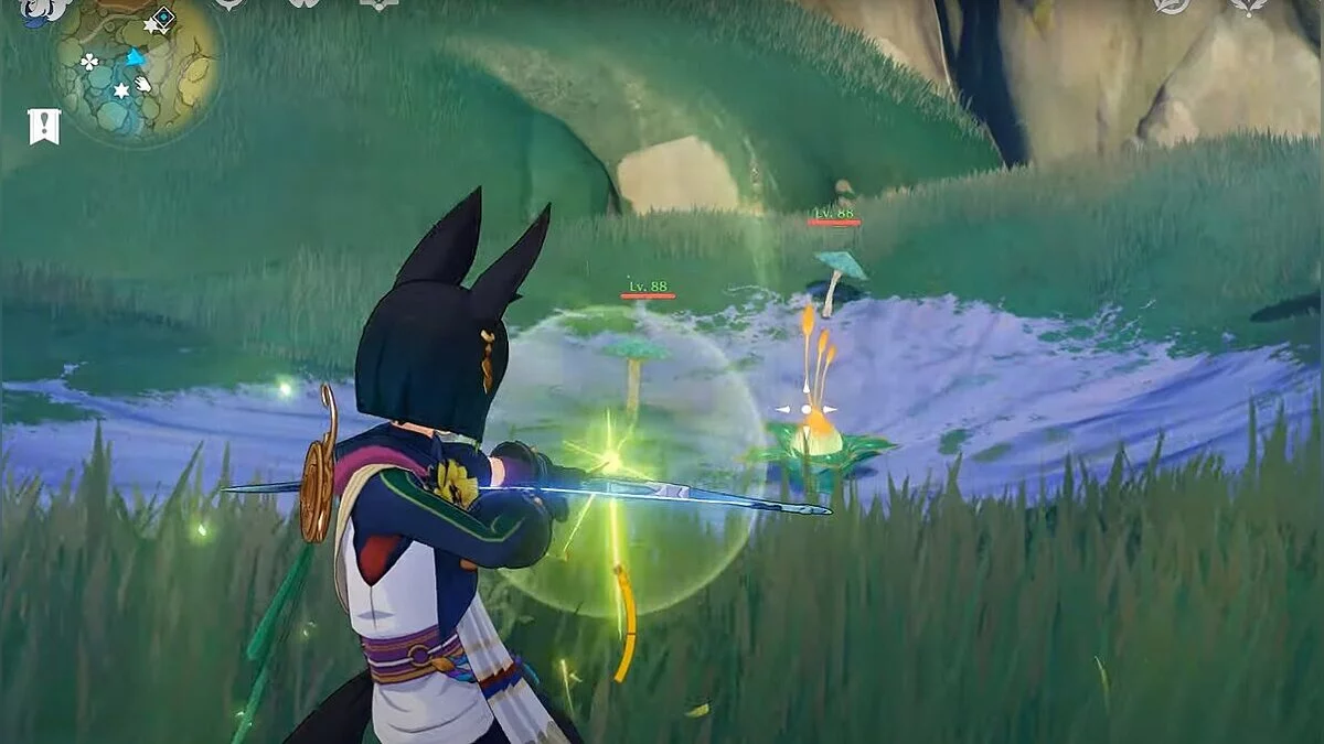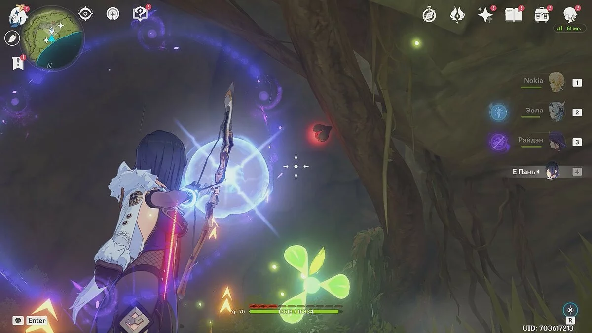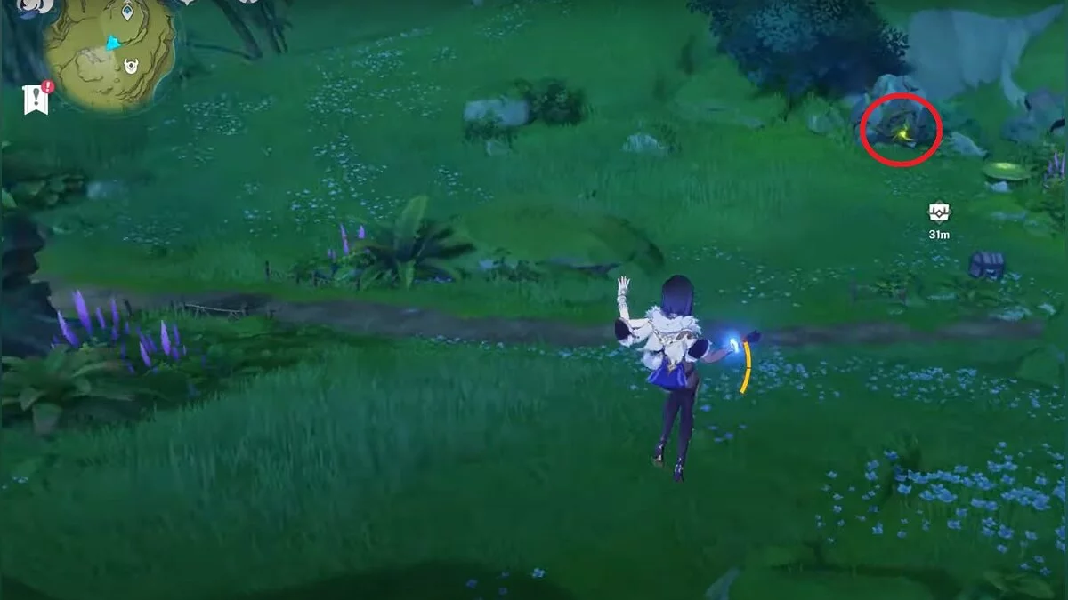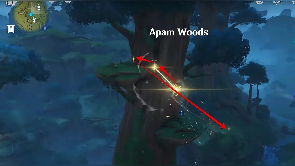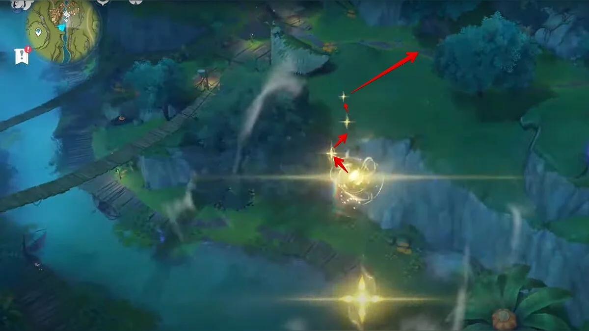 Здесь вам предстоит решить несложную головоломку. Переключитесь на Дендро-персонажа или возьмите дендрогранум, затем выстрелите по камню, который обвит лианами. Теперь вам нужно поразить мишени справа и слева от него.