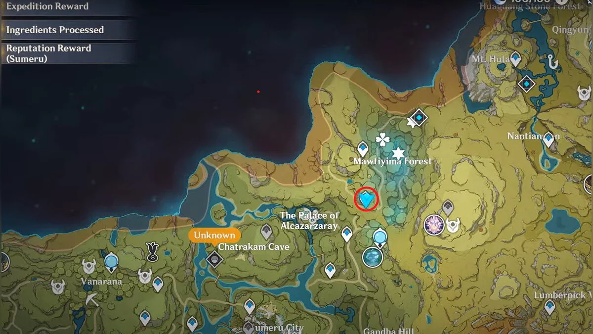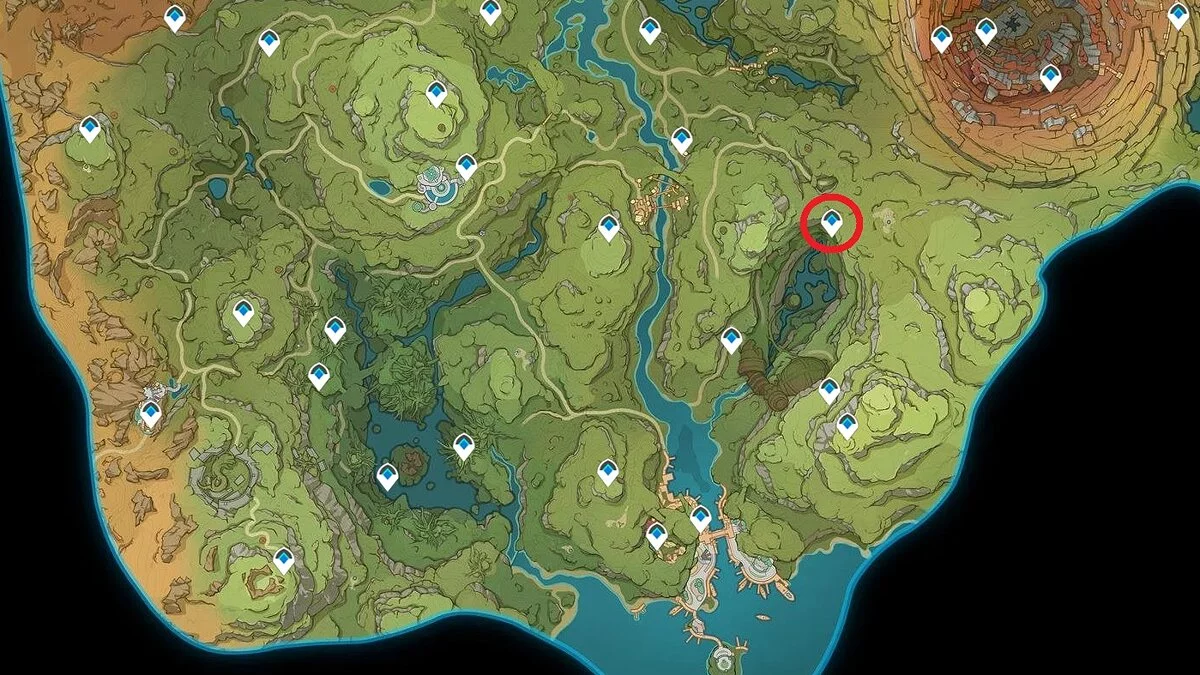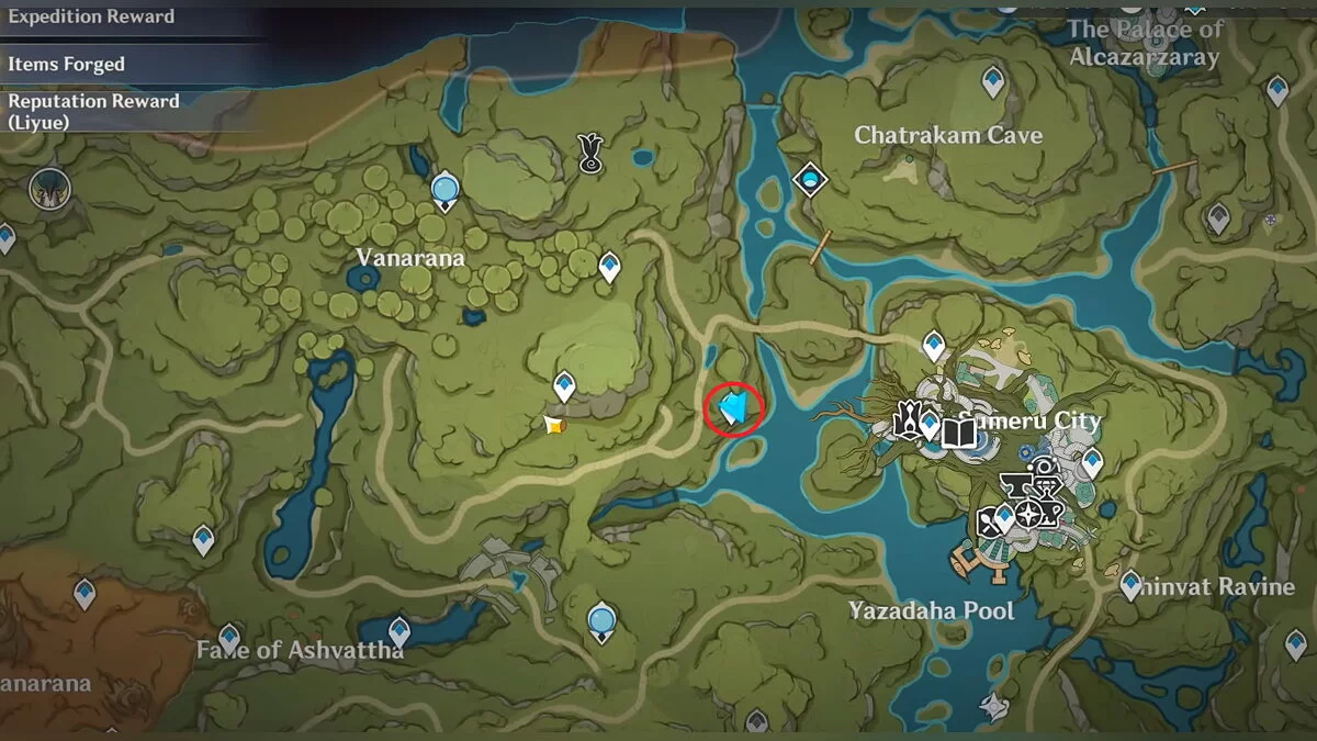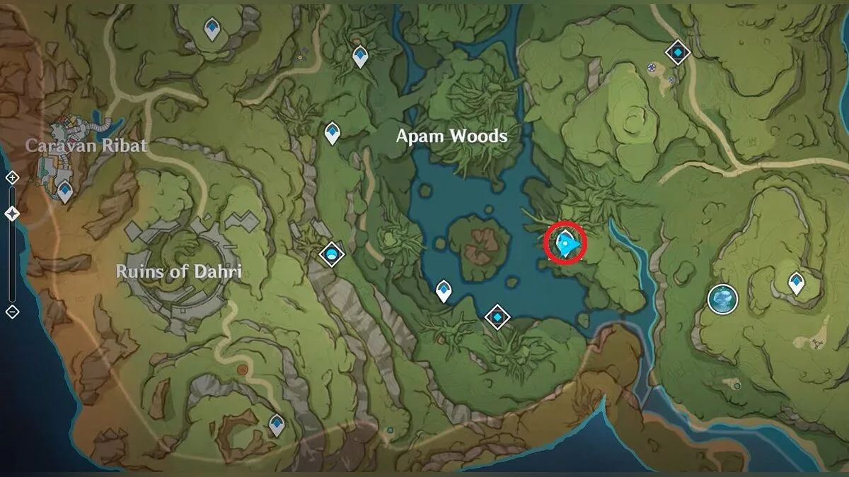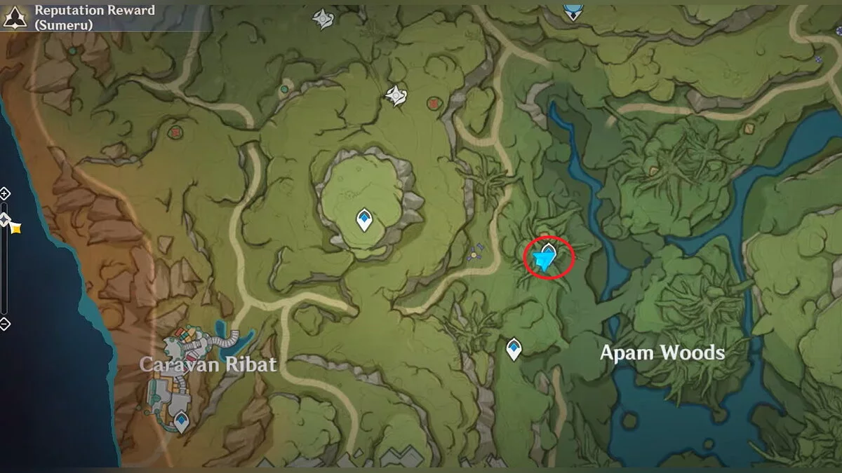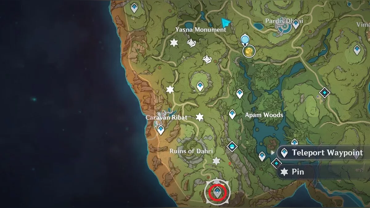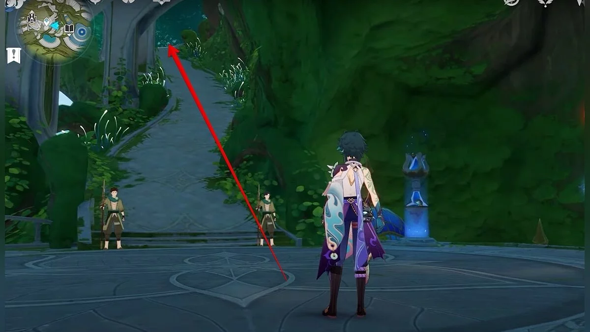 Отправляйтесь на север от статуи Дендро Архонта и доберитесь до значка телепорта. Если вы не были здесь ранее, то точка телепортации будет неактивна. Следуйте по дороге и найдите вход в пещеру.