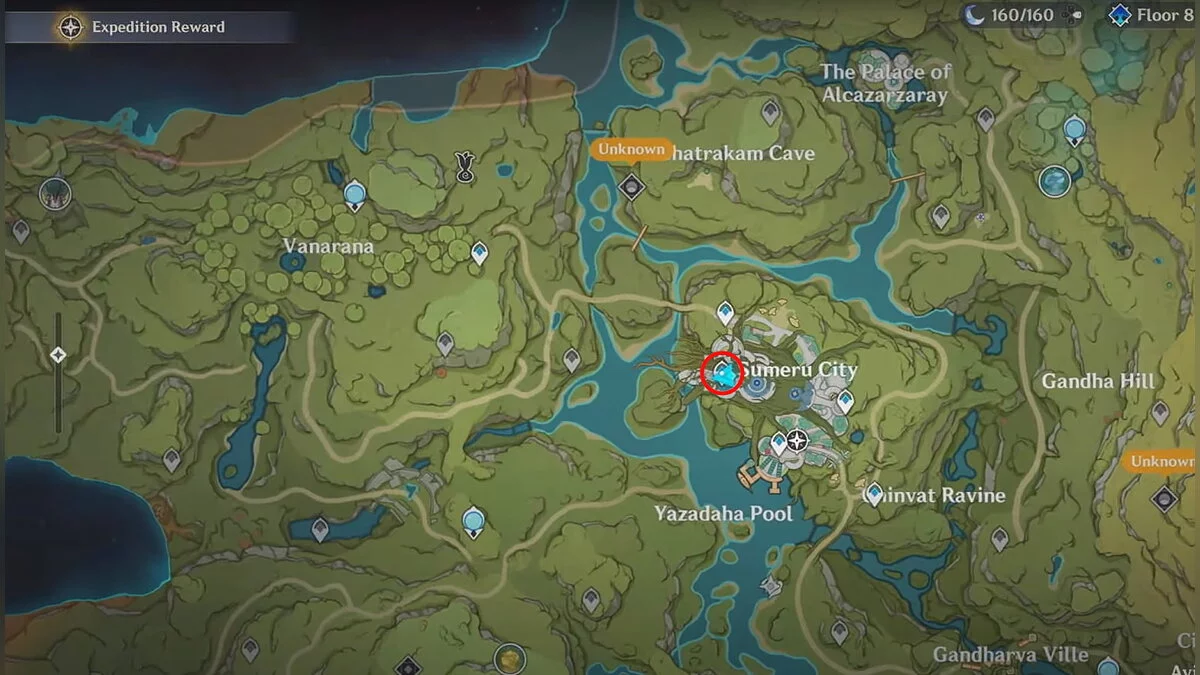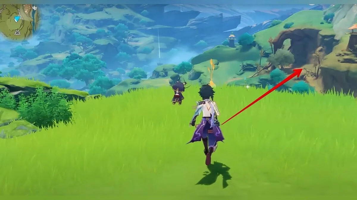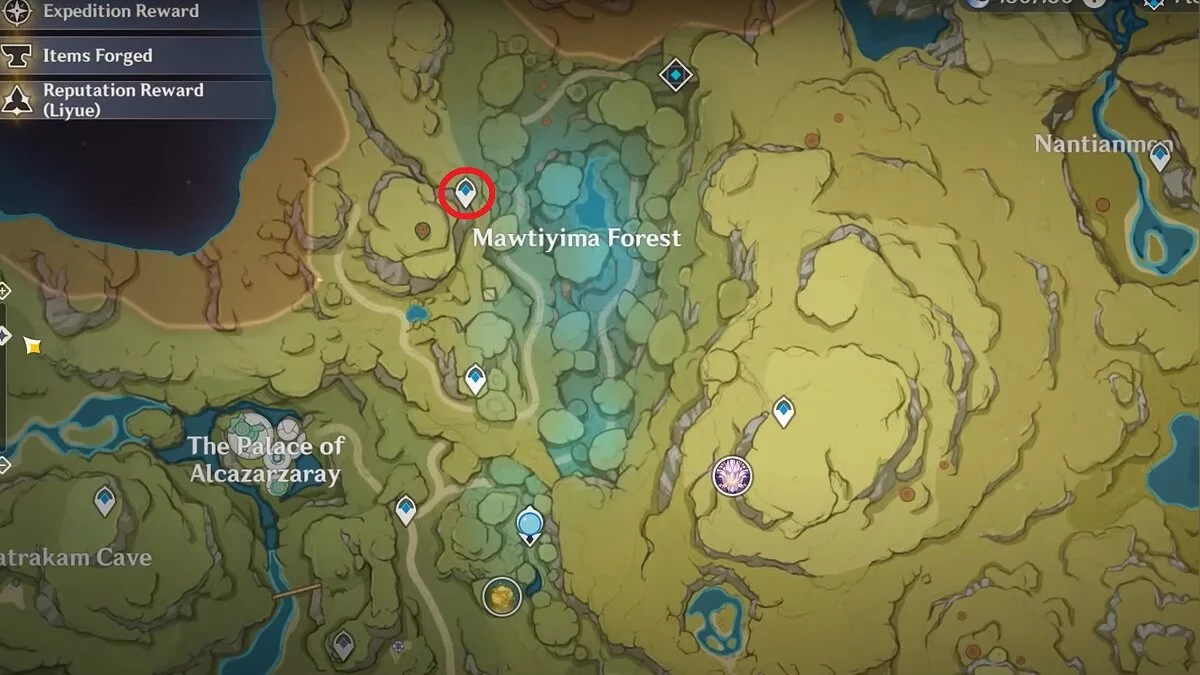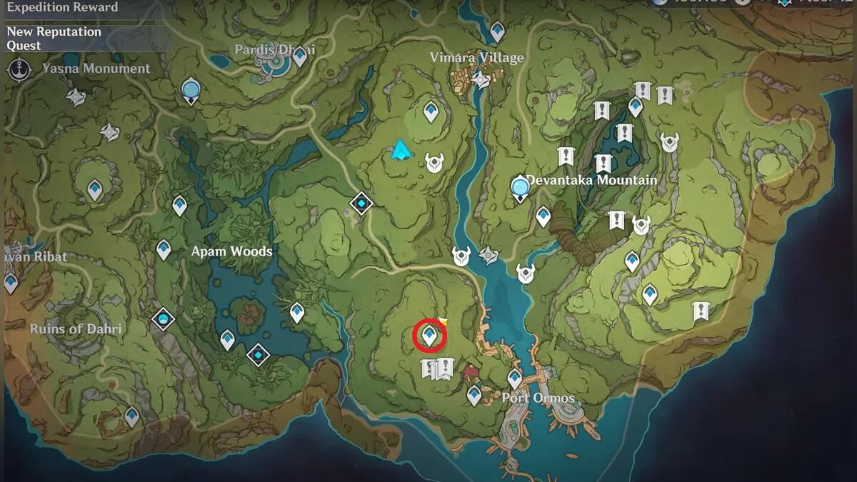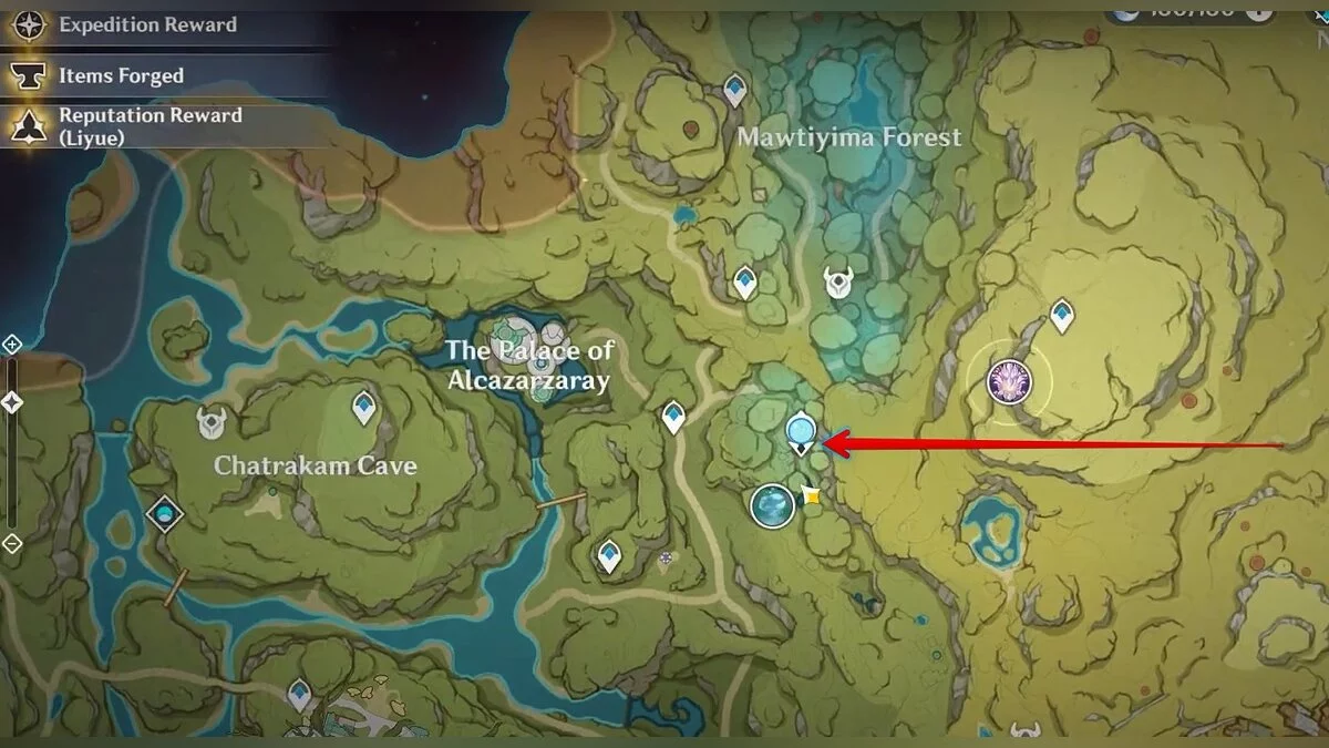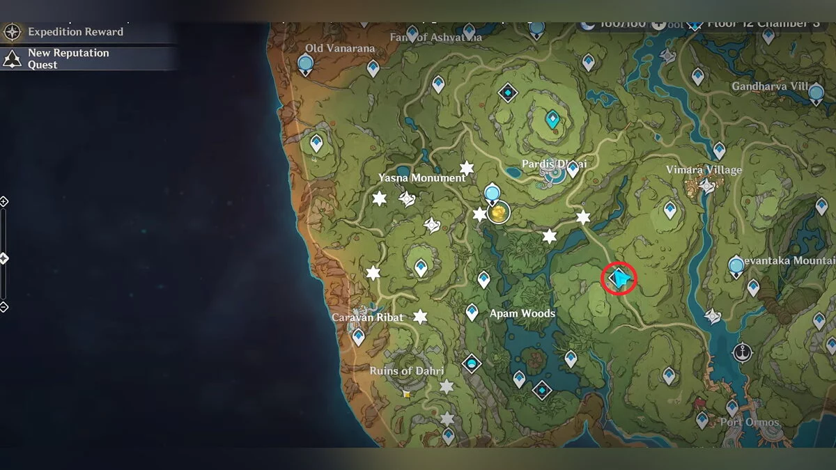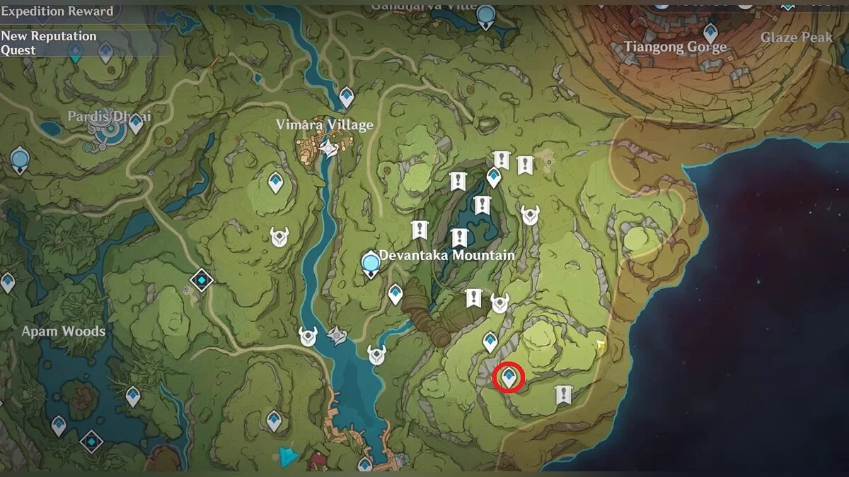 Отправляйтесь на север от статуи Дендро Архонта и доберитесь до значка телепорта. Если вы не были здесь ранее, то точка телепортации будет неактивна. Следуйте по дороге и найдите вход в пещеру.
