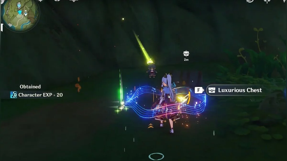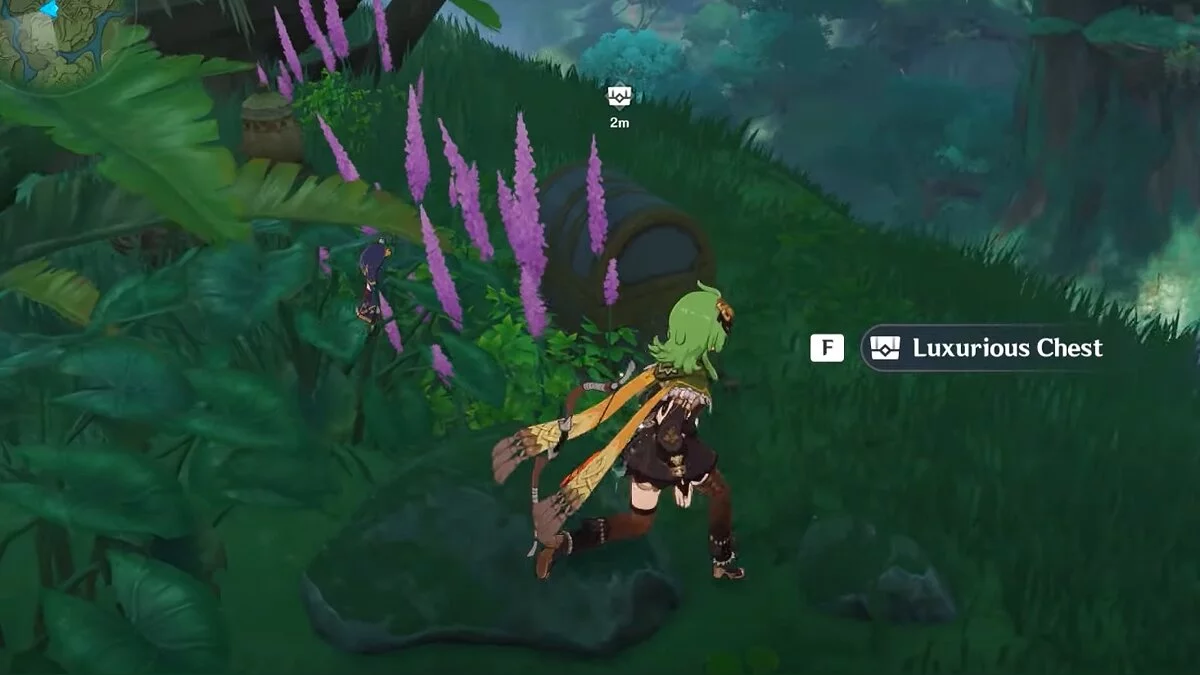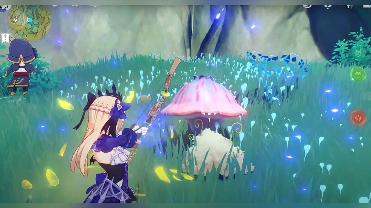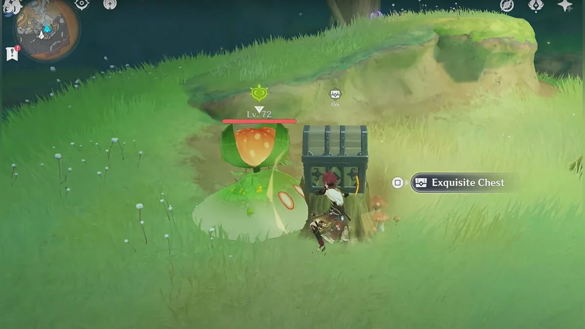Одолейте пиро слаймов. После этого бейте по грибу Дендро-персонажем, а затем ударьте по нему электричеством. Останется только активировать механизм, который находится рядом. Забирайте Дендрокул и открывайте обычный сундук.