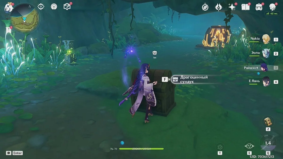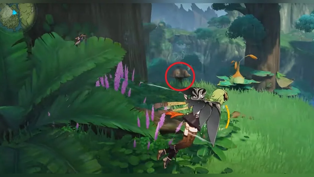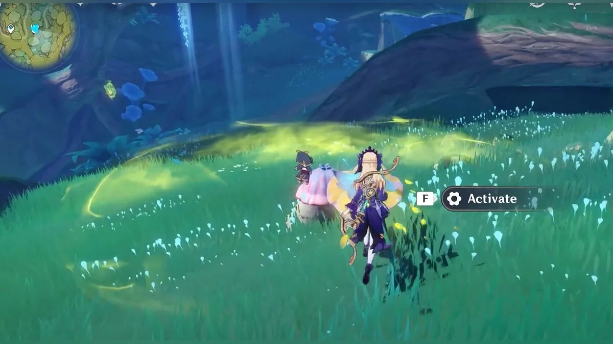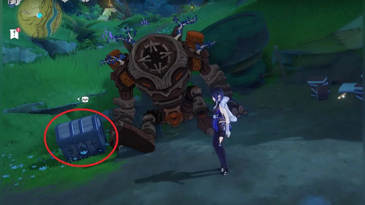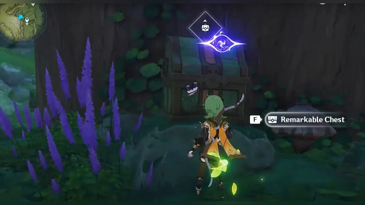 Одолейте пиро слаймов. После этого бейте по грибу Дендро-персонажем, а затем ударьте по нему электричеством. Останется только активировать механизм, который находится рядом. Забирайте Дендрокул и открывайте обычный сундук.