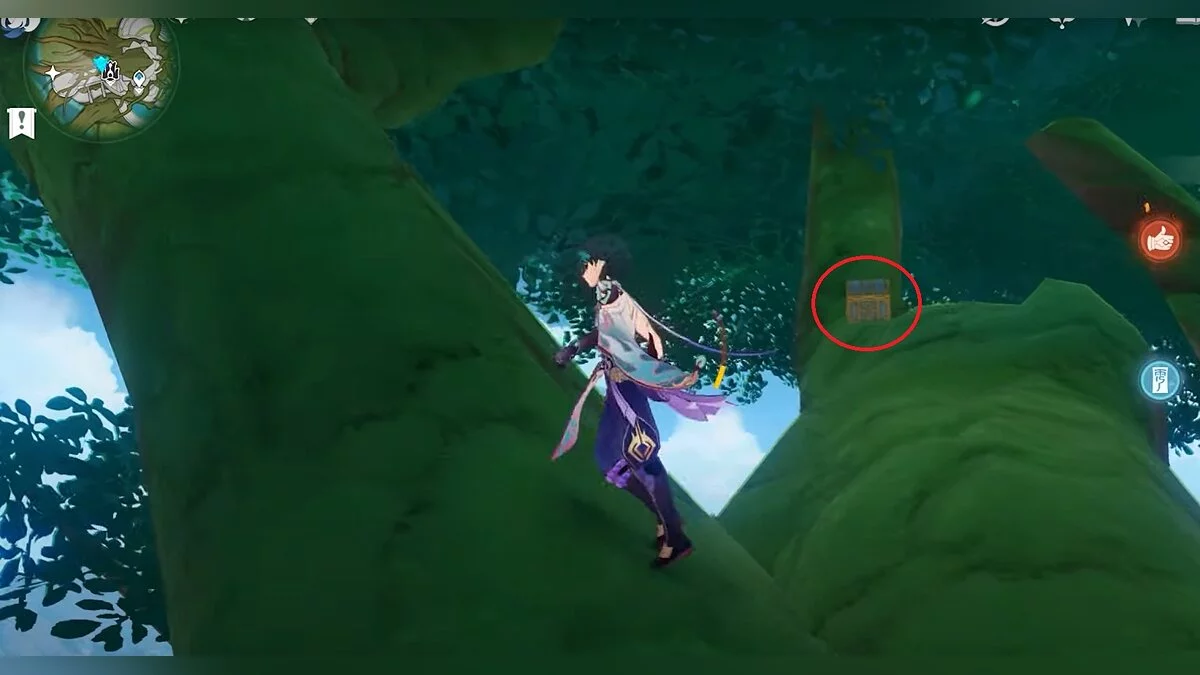 По склону поднимайтесь наверх, пока не увидите справа кучу корней с перепонкой. Рядом с ней вам нужно сыграть на лире, а затем провести атаку любой стихией. Там будет первый сундук, который вам нужен.