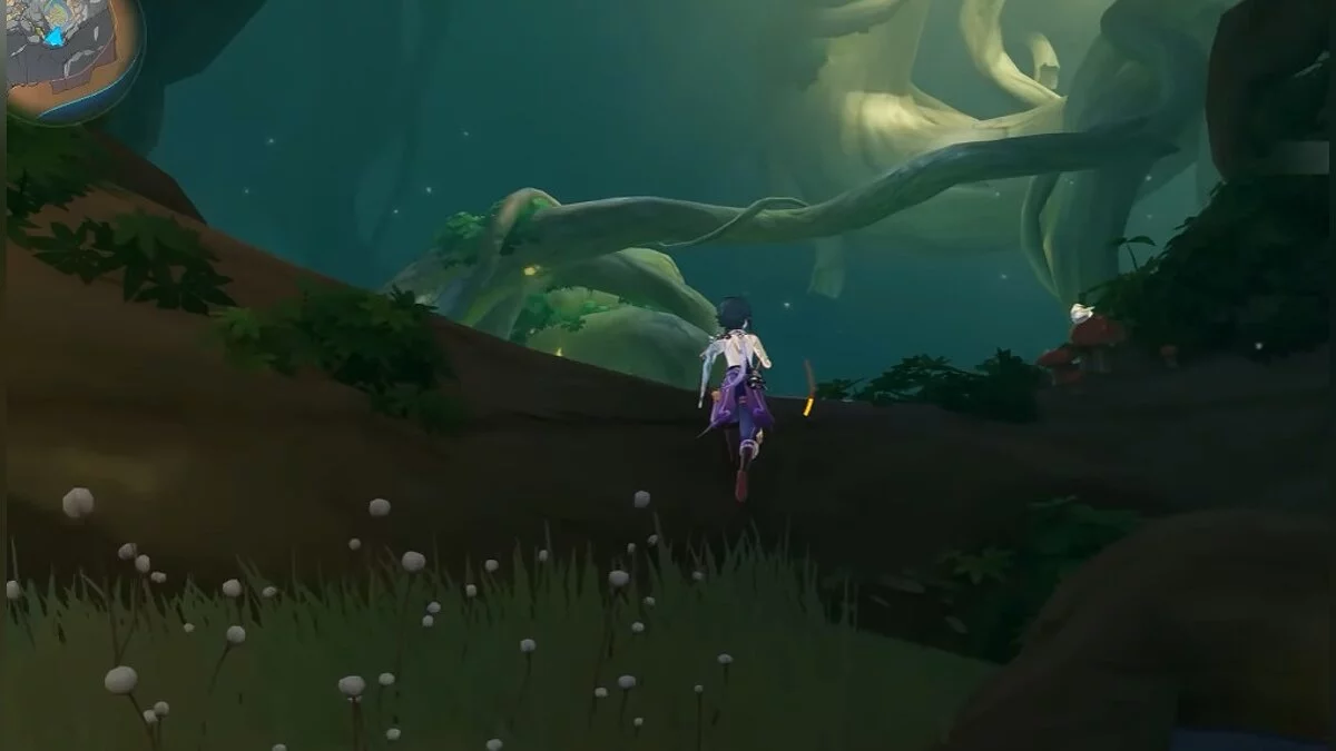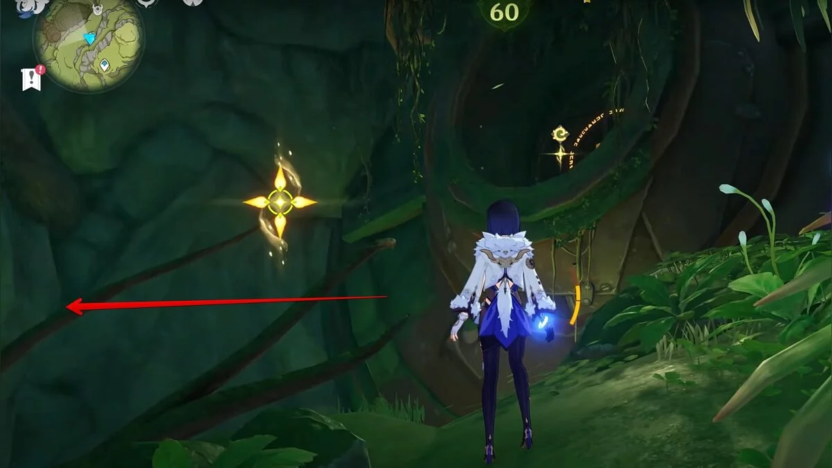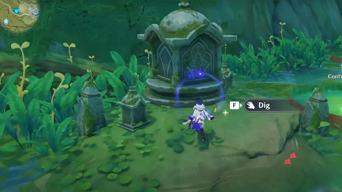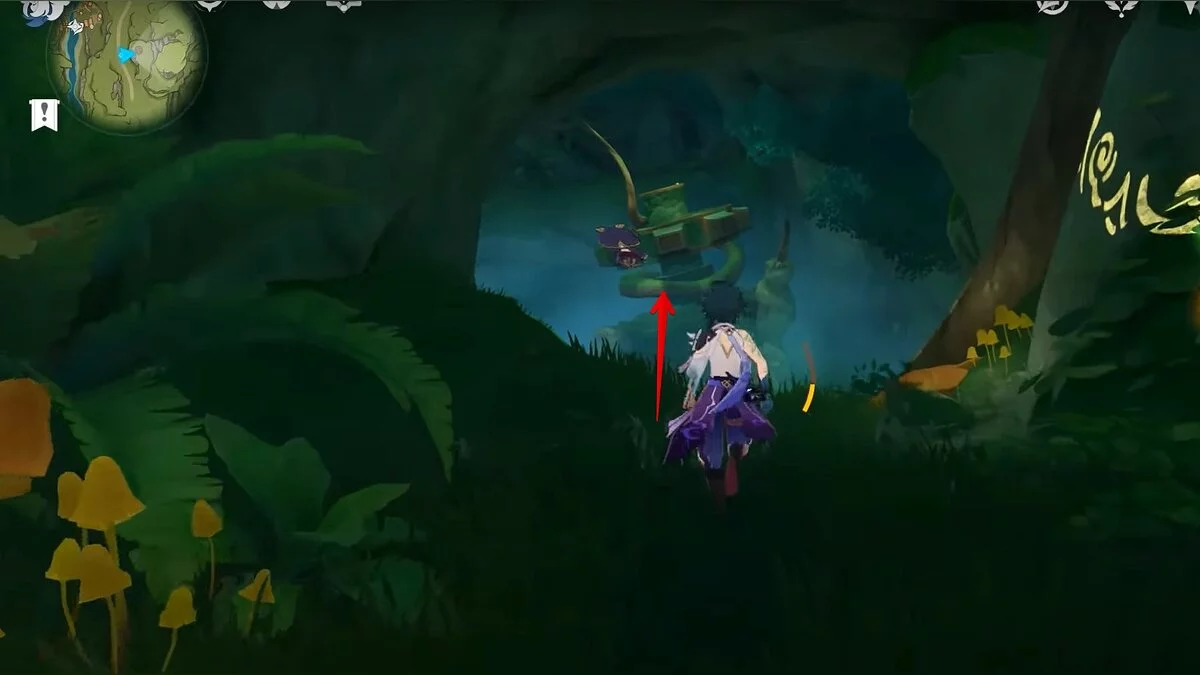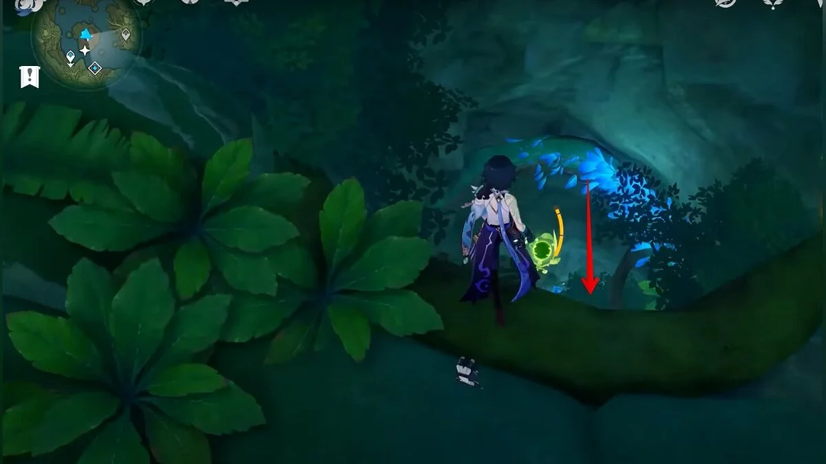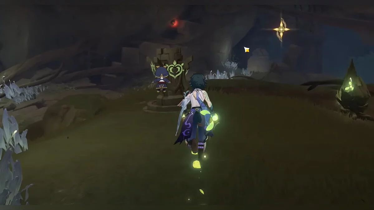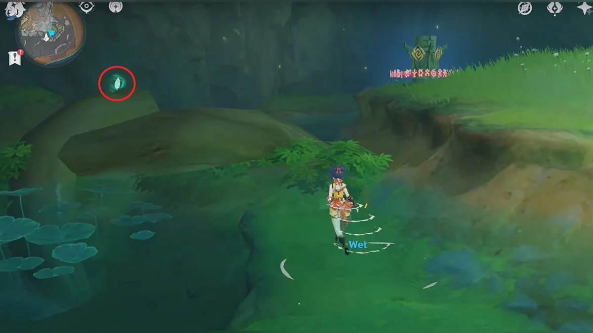 Бегите вперёд и активируйте телепорт. Пещера поделена на три уровня, но нижний уровень затоплен. На среднем уровне вы увидите статую стихии Дендро, которая заблокирована печатью. Чтобы открыть к ней доступ, призовите дендрогранумы (или используйте персонажа стихии Дендро), затем уничтожьте несколько заражённых ветвей и цветков.